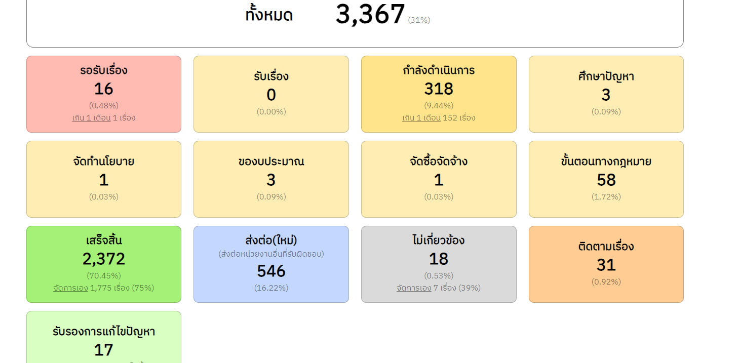 | 102 | ![]() | 2024-04-29 00:00:00.0000000 | 75.00 | 0.00 | ผลการดำเนินการแก้ไขเรื่องเรียนผ่านระบบ Traffy Fondue ระหว่างวันที่ 2 ต.ค. 66 - 29 เม.ย. 67 มีรายละเอียดดังนี้ รอรับเรื่อง 16 (0.48%) / รับเรื่อง 0 (0%) / กำลังดำเนินการ 318 (9.44%) / ศึกษาปัญหา 3 (0.09%) / จัดทำนโยบาย 1 (0.03%) / ของบประมาณ 3 (0.09%) จัดซื้อจัดจ้าง 1 (0.03%) / ขั้นตอนทางกฎหมาย 58 (1.72%) / เสร็จสิ้น 2,372 (70.45%) - จัดการเอง 1,775 (75%) / ส่งต่อใหม่ 546 (16.22%) / ไม่เกี่ยวข้อง 18 (0.53%) / ติดตามเรื่อง 31 (0.92%) / รับรองการแก้ไขปัญหา 17 (0.72%) | ||