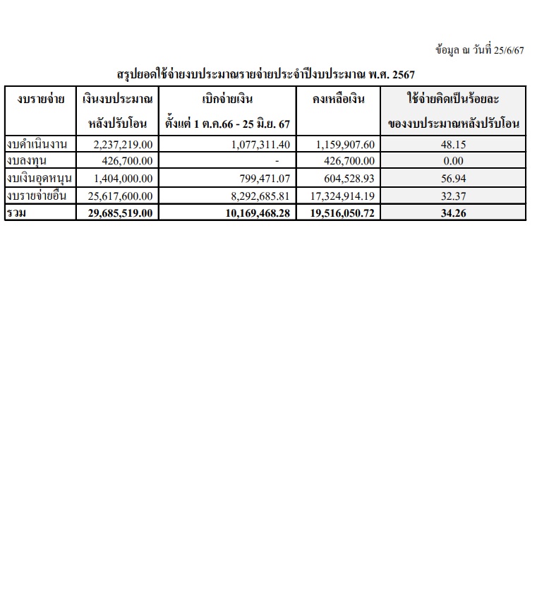 | 1415 | ![]() | 2024-06-25 00:00:00.0000000 | 4.63 | 0.00 | ปัจจุบันมีการเบิกจ่ายงบดำเนินงาน งบเงินอุดหนุน และงบรายจ่ายอื่น เป็นเงินทั้งสิ้น 10,169,468.28 บาท จากงบประมาณหลังปรับโอน 29,685,519 บาท คิดเป็นร้อยละ 34.26 ของงบประมาณหลังปรับโอน | ||