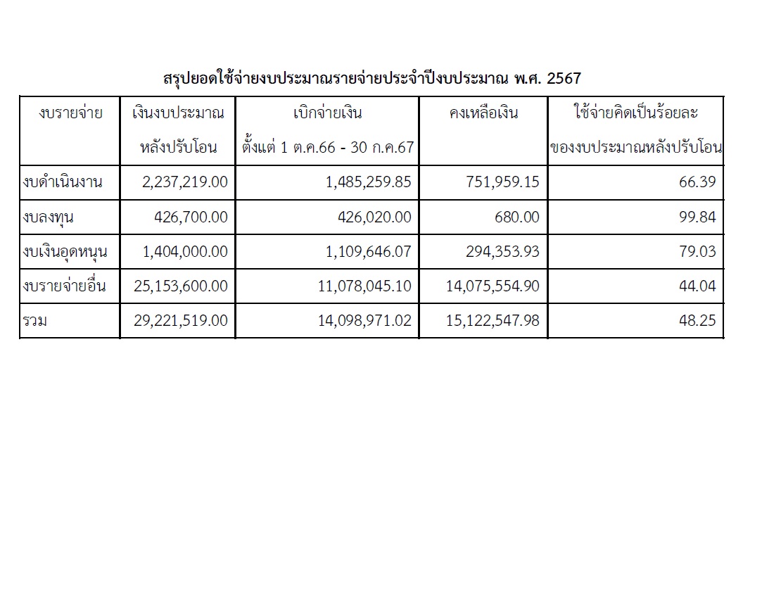 | 1415 | ![]() | 2024-07-31 00:00:00.0000000 | 13.99 | 0.00 | ปัจจุบันมีการเบิกจ่ายงบดำเนินงาน งบเงินอุดหนุน และงบรายจ่ายอื่น เป็นเงินทั้งสิ้น 14,098,971.02 บาท จากงบประมาณหลังปรับโอน 29,221,519 บาท คิดเป็นร้อยละ 48.25 ของงบประมาณหลังปรับโอน | ||