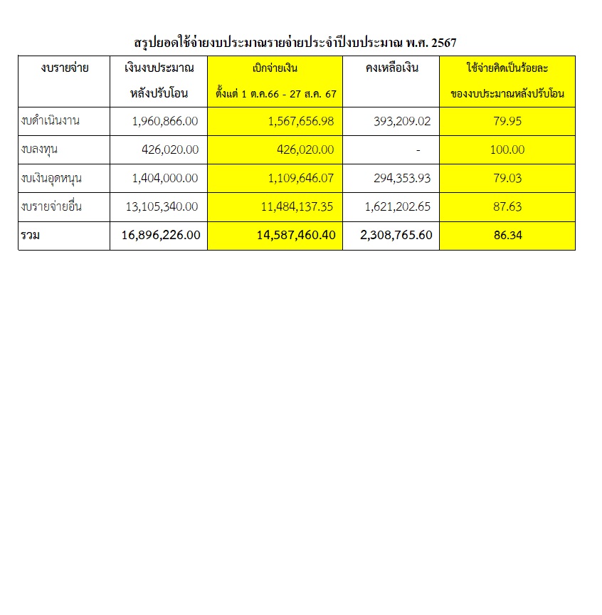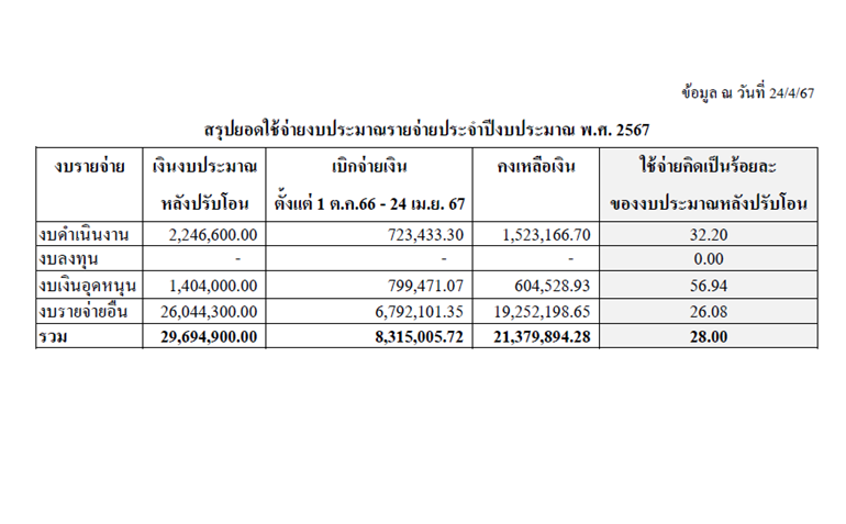 | 1415 | ![]() | 2024-08-28 00:00:00.0000000 | 38.09 | 0.00 | ปัจจุบันมีการเบิกจ่ายงบดำเนินงาน งบเงินอุดหนุน งบลงทุน และงบรายจ่ายอื่น เป็นเงินทั้งสิ้น 14,587,460.40 บาท จากงบประมาณหลังปรับโอน 16,896,226 บาท คิดเป็นร้อยละ 86.34 ของงบประมาณหลังปรับโอน เนื่องจากมีการโอนเงินเหลือจ่ายคืน เป็นเงิน 12,928,192 บาท ร้อยละความสำเร็จของการเบิกจ่ายงบประมาณในภาพรวม 86.34 | ||