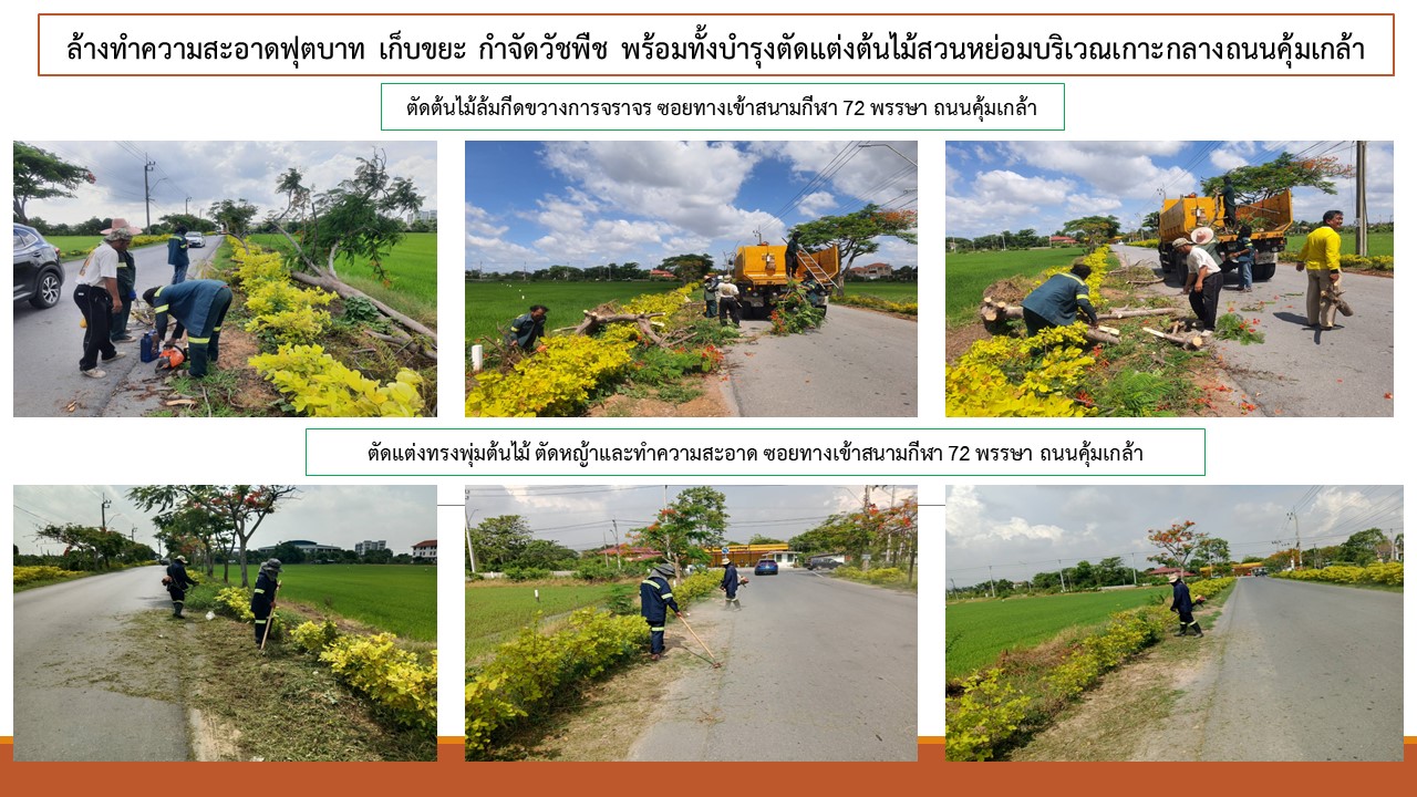 | 1 | ![]() | 2024-04-25 00:00:00.0000000 | 0.00 | 0.00 | ฝ่ายรักษาความสะอาดฯ ดำเนินการล้างทำความสะอาดฟุตบาท เก็บขยะ กำจัดวัชพืช พร้อมทั้งบำรุงตัดแต่งต้นไม้สวนหย่อมบริเวณเกาะกลางถนนสามวา ตั้งแต่แยกทางเข้าถนนสามวาถึงสุดเขต ทั้ง 2 ฝั่ง ฝ่ายเทศกิจ จัดเจ้าหน้าที่เทศกิจออกตรวจตรากวดขันผู้ค้าหาบเร่แผงลอยบริเวณถนนสามวา และถนนคุ้มเกล้า เป็นประจำทุกวัน ฝ่ายโยธาซ่อมแซมผิวจราจรถนนคุ้มเกล้า |