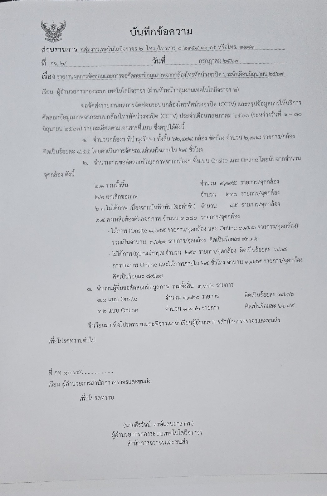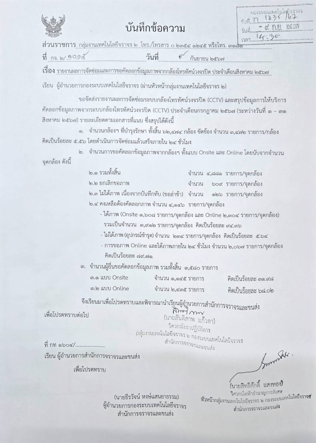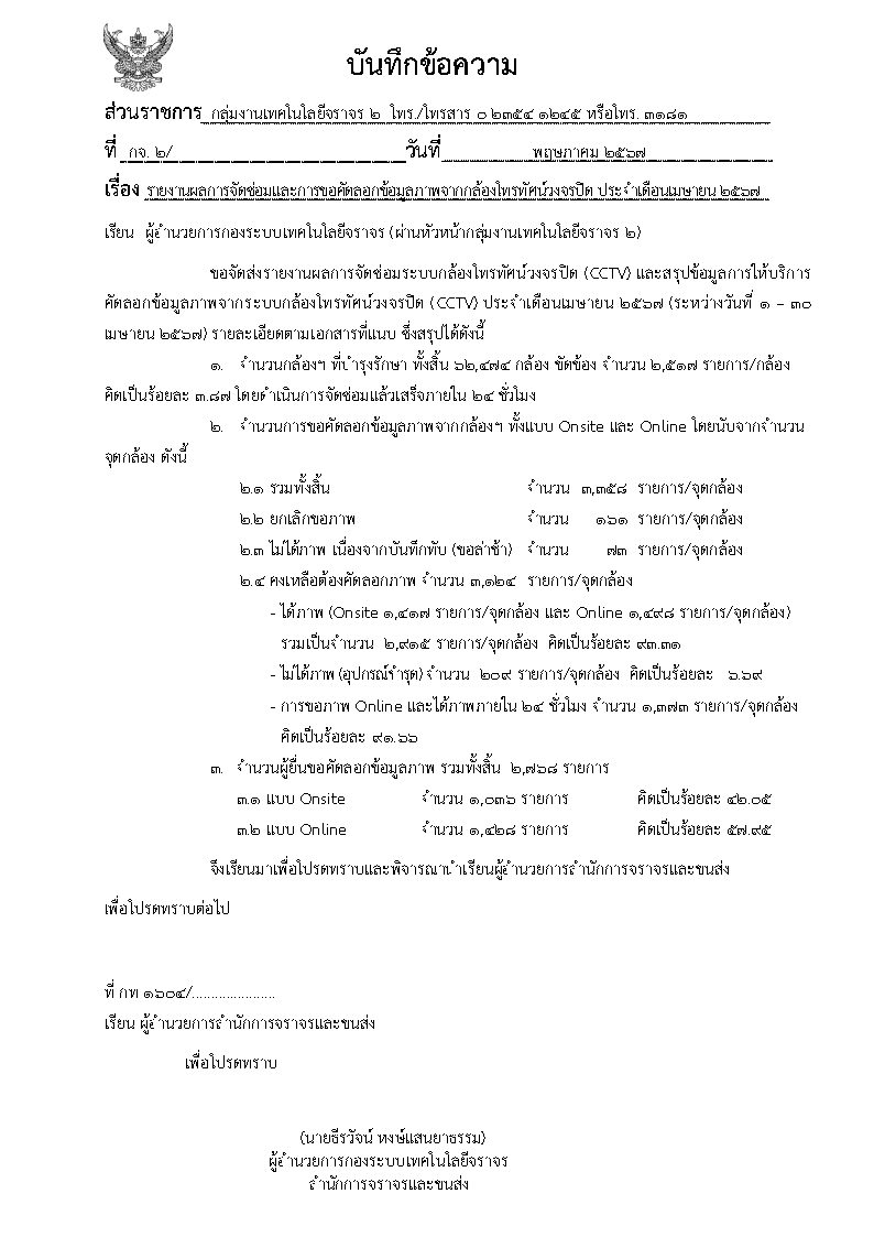 | 731 | ![]() | 2024-05-27 00:00:00.0000000 | 65.00 | 0.00 | - การขอภาพ Online และได้ภาพภายใน ๒๔ ชั่วโมง จำนวน ๑,๓๗๓ รายการ/จุดกล้อง คิดเป็นร้อยละ ๙๑.๖๖ |