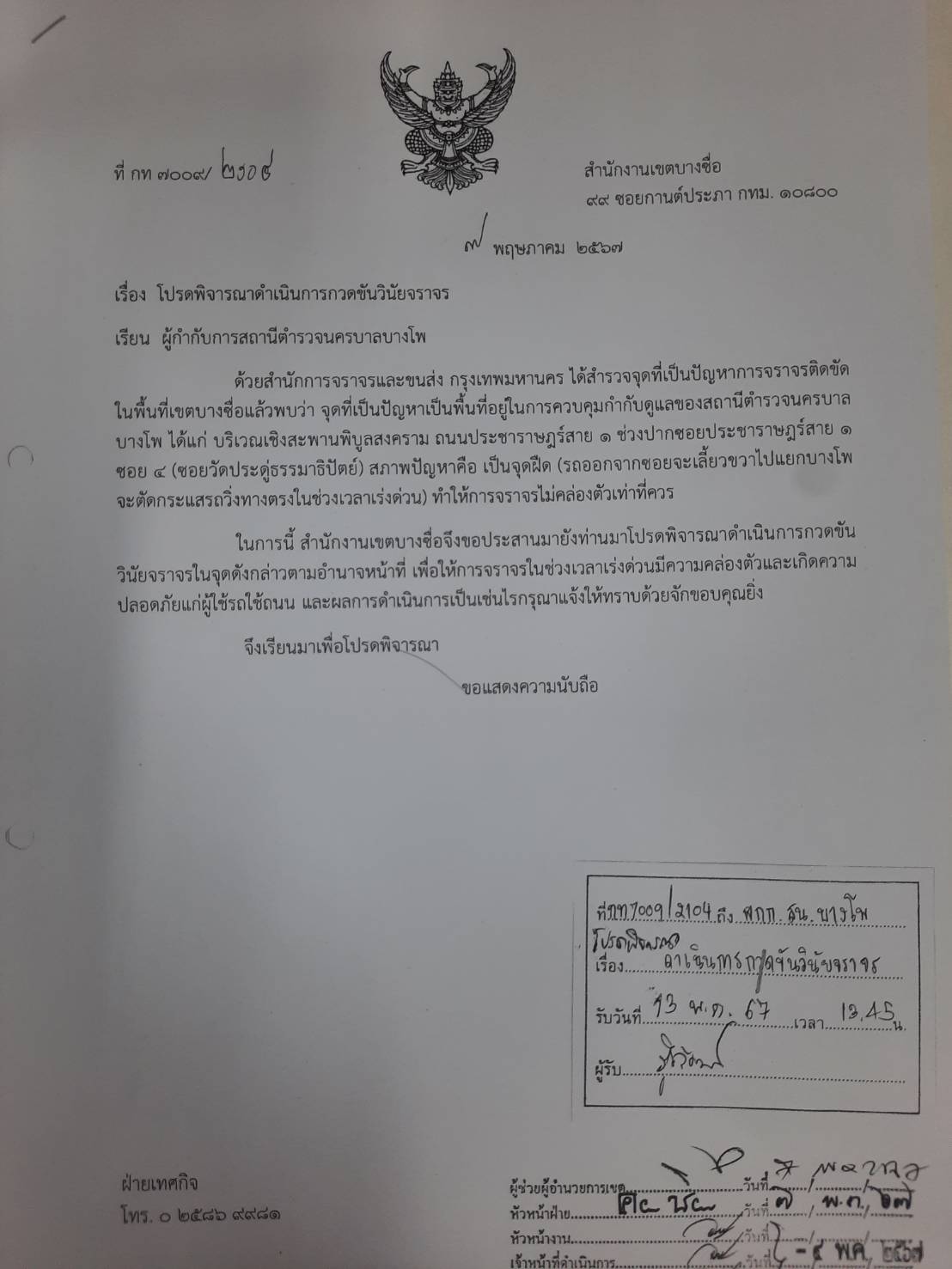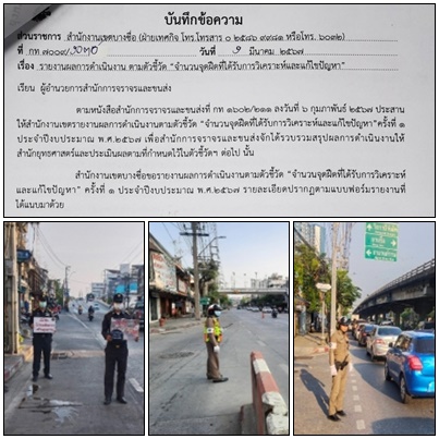 | 10 | ![]() | 2024-05-26 00:00:00.0000000 | 0.00 | 0.00 | อยู่ในระหว่าง ดำเนินการตามแผนโครงการ (ทำหนังสือประสาน ส.น. พิจารณาดำเนินการกวดขันวินัยจราจรในจุดที่มีปัญหาจราจรติดขัด ) จุดที่ 1 บริเวณเชิงสะพานพิบูลสงคราม (ปากซอยวัดประดู่ธรรมาธิปัตย์) ถนนประชาราษฎร์สาย 1 จุดที่ 2 จุดกลับรถใต้สะพานข้ามแยกประชานุกูล | ||