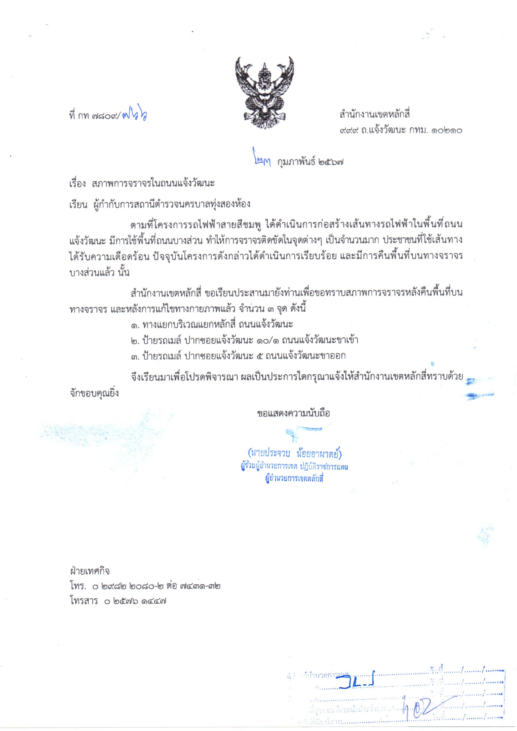 | 10 | ![]() | 2024-03-25 00:00:00.0000000 | 0.00 | 0.00 | จักทำรายการผลดารดำเนินการ ครั้งที่ 1 รายงานต่อสจส. โดยทำหนังสือประสานสถานีตำรวจนครบาลทุ่งสองห้อง สอบถามสภาพการจราจรบริเวณจุดฝืด และขอความร่วมมือกวดขันวินัยการจราจรและอำนวยความสะดวกการจราจรในจุดฝืดทั้ง 3 จุด | ||