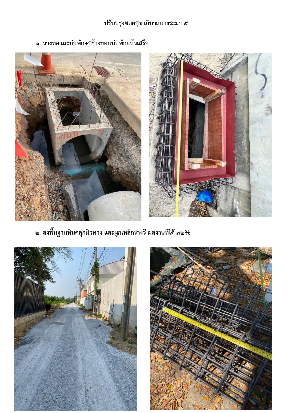 | 1526 | ![]() | 2024-04-25 00:00:00.0000000 | 0.00 | 0.00 | - วางท่อและบ่อพัก+สร้างขอบบ่อพักแล้วเสร็จ - ลงพื้นฐานหินคลุกผิวทางและผูกเหล็กรางวี ผลงานที่ได้ 72% | ||