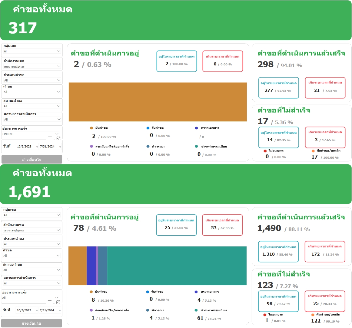 ![]() | 10 | รายงานจำนวนผู้รับบริการผ่านระบบศูนย์รับคำขออนุญาตของกรุงเทพมหานคร (BMA OSS) และจำนวนผู้รับบริการ ณ สำนักงานเขต (เฉพาะกระบวนงานตามระบบ BMA OSS 108 กระบวนงาน) ผ่านระบบ BMA Policy Tracking ประจำเดือนกรกฎาคม 2567 | 8.00 | 2024-07-01 00:00:00.0000000 | 2024-07-31 00:00:00.0000000 |