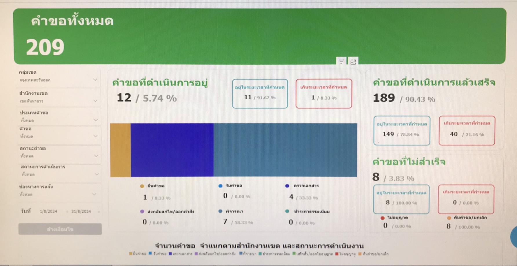 14142024-09-11 00:00:00.00000000.000.00- จำนวนคำขอทั้งหมด 209 (ข้อมูล เดือนสิงหาคม 67) - สรุปข้อมูลผลการดำเนินงาน (2 ต.ค. 66 - 31 ส.ค. 67) จำนวนผู้มารับบริการทั้งหมด (BFC+OSS) คือ 2,139 ครั้ง จำนวนผู้รับบริการ OSS จำนวน 469 ครั้ง ผลการดำเนินการ 21.92 %
