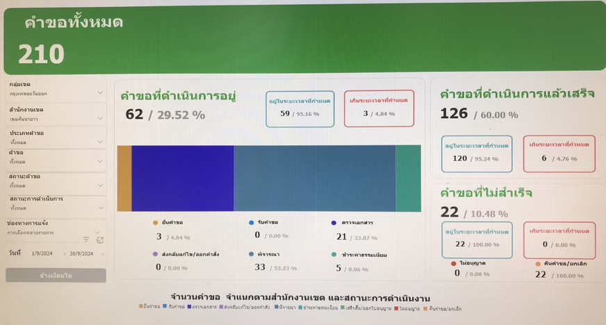 14142024-09-30 00:00:00.00000005.000.00- จำนวนคำขอทั้งหมด 210 (ข้อมูล เดือนกันยายน 67) - สรุปข้อมูลผลการดำเนินงาน (2 ต.ค. 66 - 31 ส.ค. 67) จำนวนผู้มารับบริการทั้งหมด (BFC+OSS) คือ 2,349 ครั้ง จำนวนผู้รับบริการ OSS จำนวน 634 ครั้ง ผลการดำเนินการ 26.99 %