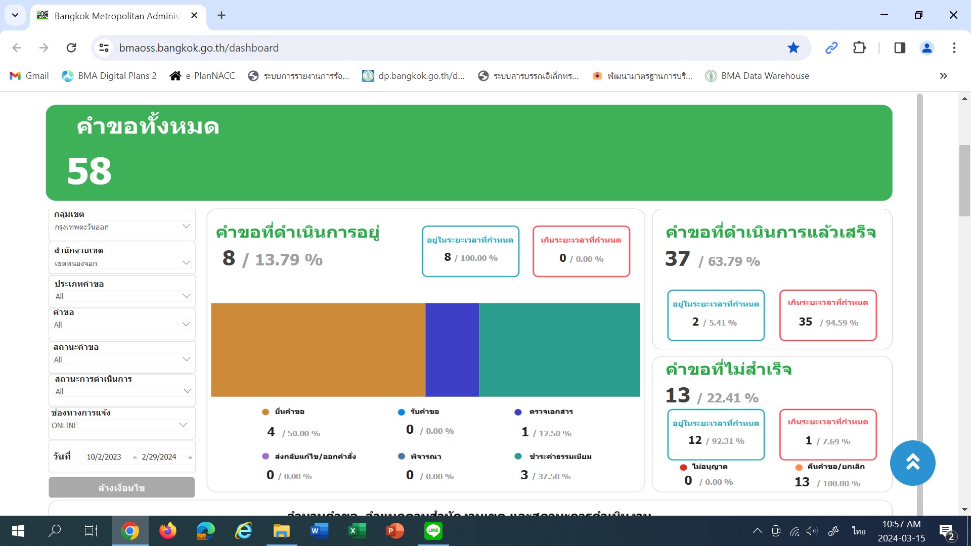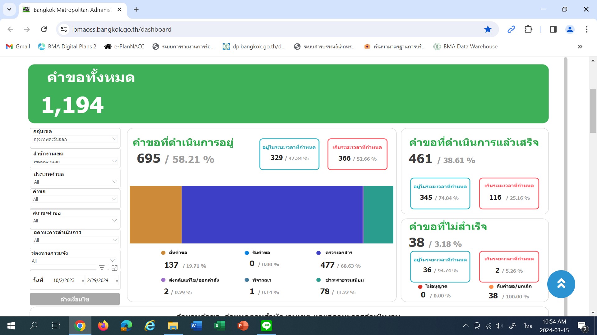 | 1414 | ![]() | 2024-03-14 00:00:00.0000000 | 4.86 | 0.00 | ตั้งแต่เดือนตุลาคม 2566 ถึงเดือนกุมภาพันธ์ 2567 มีจำนวนผู้รับบริการ ดังนี้ 1) จำนวนผู้รับบริการผ่านระบบศูนย์รับคำขออนุญาตของกรุงเทพมหานคร (BMA OSS) จำนวน 58 คน 2) จำนวนผู้รับบริการของสำนักงานเขตทั้งหมด (เฉพาะกระบวนงานตามระบบ BMA OSS) จำนวน 1,194 คน คิดเป็น ร้อยละ 4.86 |