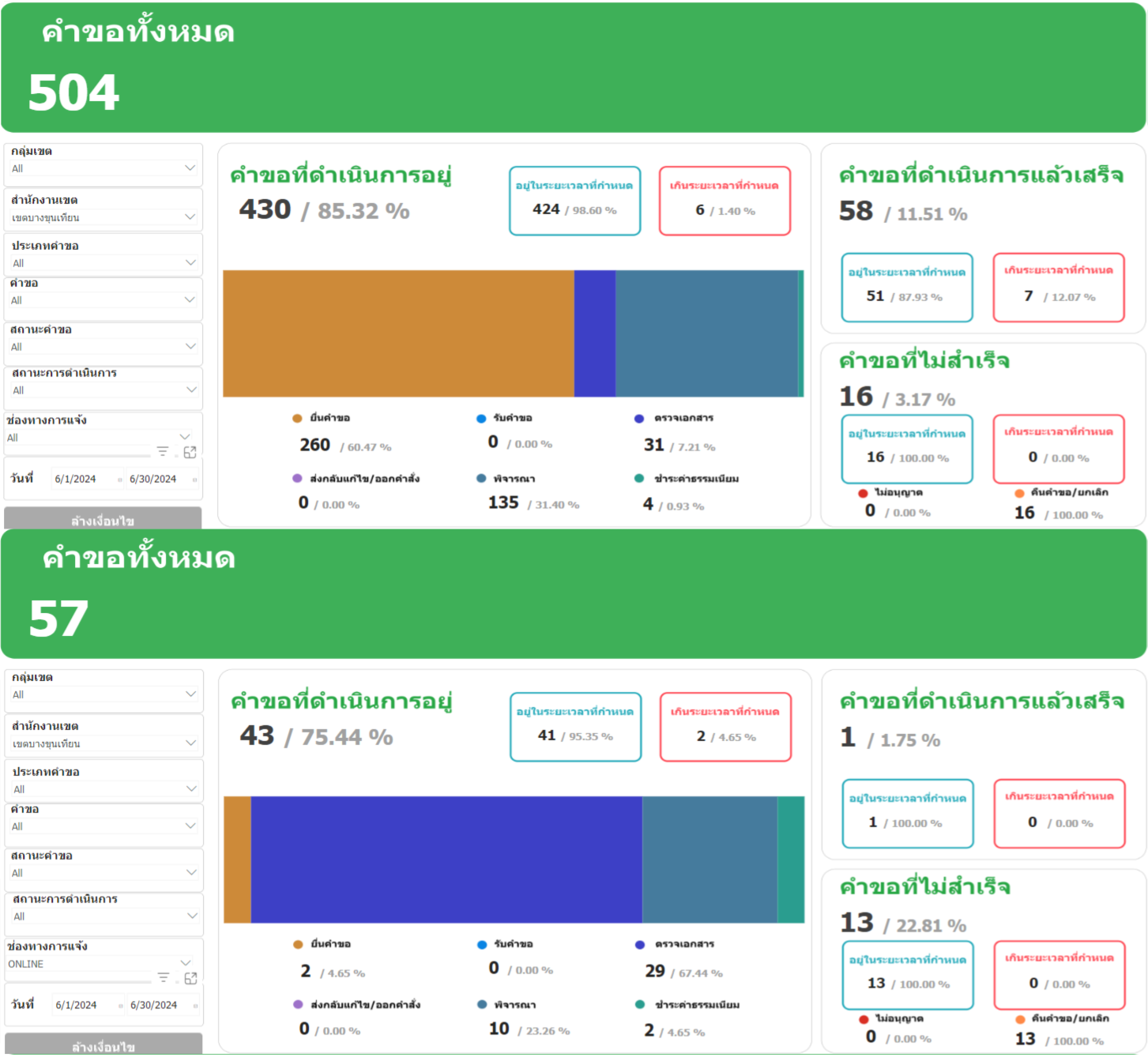 14142024-07-08 00:00:00.00000000.000.00เดือนมิถุนายน 2567 ผู้รับบริการผ่านระบบ BMA OSS จำนวน 57 ราย ผู้รับบริการของสำนักงานเขตทั้งหมด จำนวน 504 ราย คิดเป็นร้อยละ 11.30