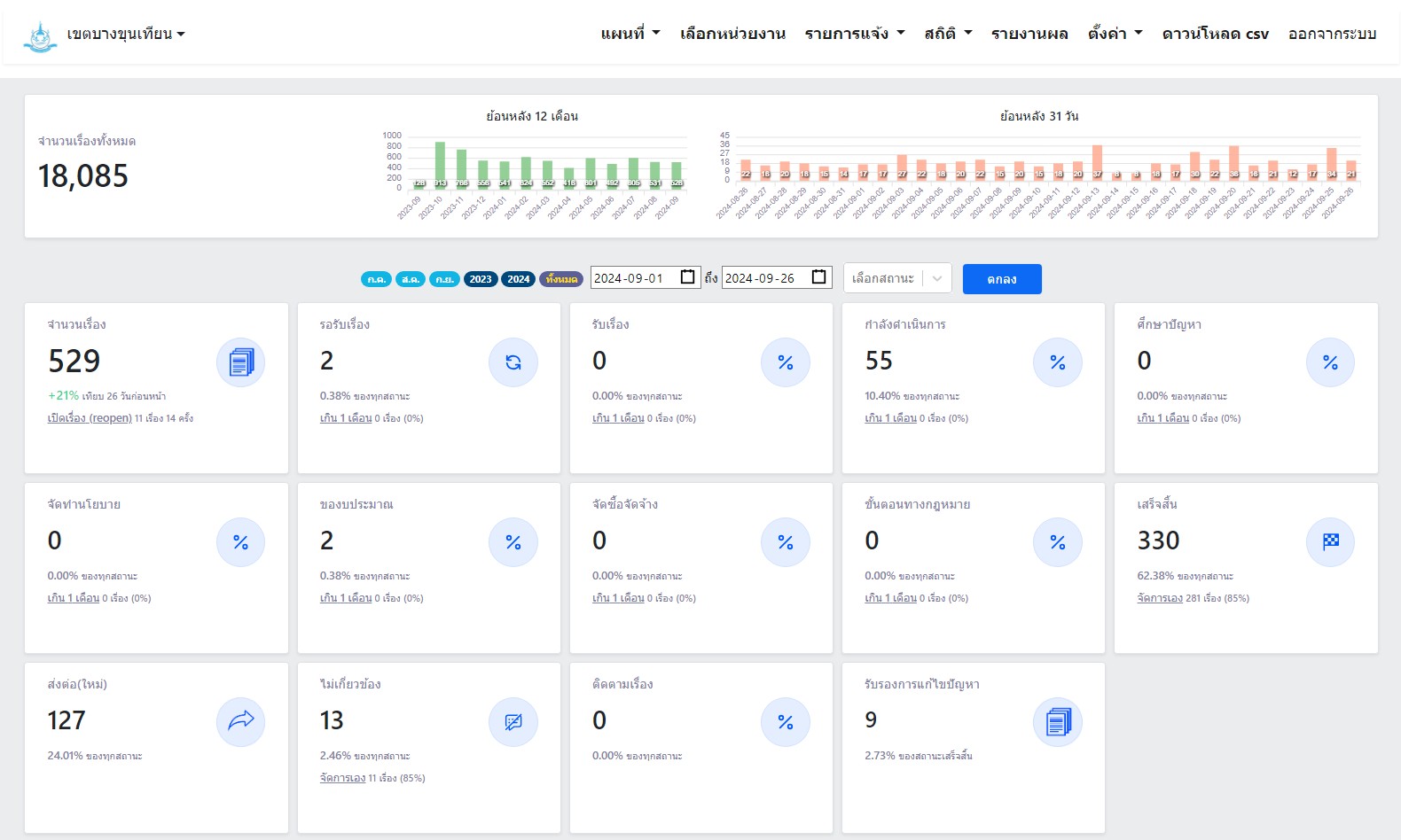 | 102 | ![]() | 2024-09-27 00:00:00.0000000 | 100.00 | 0.00 | 1 ก.ย. 67 - 26 ก.ย. 67 จำนวนทั้งหมด 529 เรื่อง ดำเนินการแล้วเสร็จ 330 เรื่อง อยู่ระหว่างรอดำเนินการ 55 เรื่อง | ||