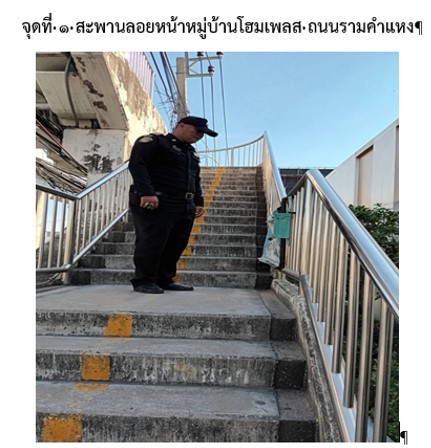 | 12 |  | 2024-03-04 00:00:00.0000000 | 1.00 | 0.00 |  | จุดที่ 1 สะพานลอยหน้าหมู่บ้านโฮมเพลส ถนนรามคำแหง ลักษณะความเสี่ยง เป็นสะพานลอย มีคนสัญจรแต่เปลี่ยว เงื่อนไขที่ต้องดำเนินการแก้ไขตรวจ คือ ดำเนินการเฝ้าระวังและตรวจตราพื้นที่เสี่ยง อย่างน้อย 1 ครั้ง/วัน | |