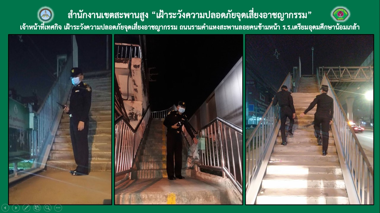| 12 |  | 2024-03-21 00:00:00.0000000 | 0.00 | 0.00 |  | เจ้าหน้าที่เทศกิจ ตรวจตราเฝ้าระวังความปลอดภัย บริเวณสะพานลอยหน้าโรงเรียนเตรียมอุดมศึกษาน้อมเกล้า ถนนรามคำแหง | |
