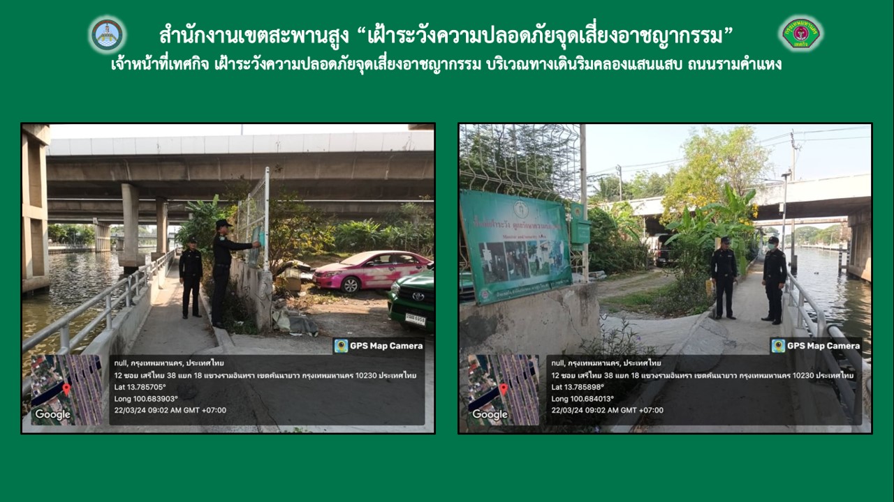 | 12 |  | 2024-03-22 00:00:00.0000000 | 0.00 | 0.00 |  | เจ้าหน้าที่เทศกิจ สำนักงานเขตสะพานสูง เฝ้าระวังความปลอดภัยในชีวิตและทรัพย์สินของประชาชน บริเวณทางเดินริมคลองแสนแสบ ถนนรามคำแหง | |
