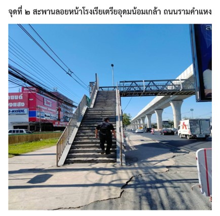 | 12 |  | 2024-03-04 00:00:00.0000000 | 1.00 | 0.00 |  | จุดที่ 2 สะพานลอยหน้าโรงเรียเตรียอุดมน้อมเกล้า ถนนรามคำแหง ลักษณะของความเสี่ยง เป็นสะพานลอย มีคนสัญจรแต่เปลี่ยว เงื่อนไขที่ต้องทดำเนินการแก้ไข จัดเจ้าหน้าที่เทศกิจดำเนินการเฝ้าระวังตรวจตราความปลอดภัย อย่างน้อย 1 ครั้ง/วัน | |