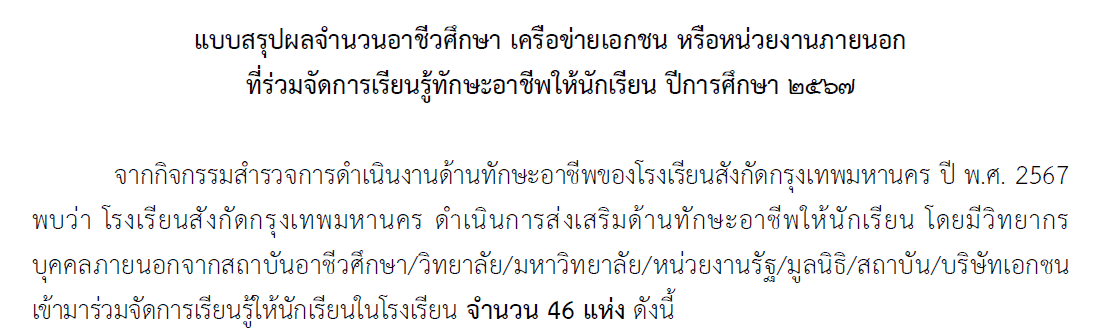 11532024-09-19 00:00:00.000000046.000.00มีวิทยากรบุคคลภายนอกจากสถาบันอาชีวศึกษา / วิทยาลัย / มหาวิทยาลัย / หน่วยงานรัฐ / มูลนิธิ / สถาบัน / บริษัทเอกชน เข้ามาร่วมจัดการเรียนรู้ให้นักเรียนในโรงเรียน จำนวน 46 แห่ง