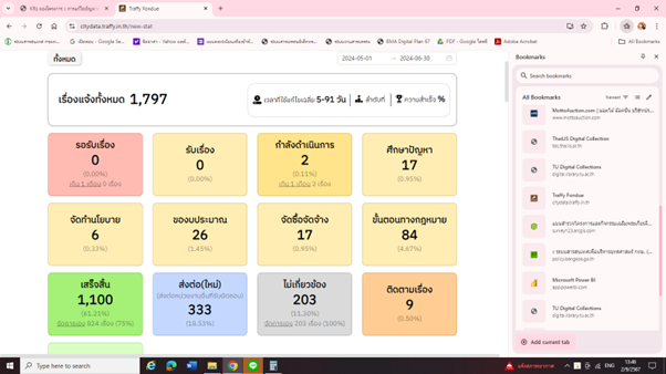 | 1500 | ![]() | 2024-06-28 00:00:00.0000000 | 87.23 | 0.00 | สถิติ Traffy Fondue สำนักงานเขตประเวศ เดือนพฤษภาคม -มิถุนายน 2567 จำนวนเรื่องแจ้งทั้งหมด 1,797 เรื่อง จำนวนเรื่องส่งต่อใหม่ 333 เรื่อง ไม่เกี่ยวข้อง 203เรื่อง (จำนวนเรื่องที่สำนักงานเขตดำเนินการเอง1,261 เรื่อง) ดำเนินการแล้วเสร็จ1,100 เรื่อง คิดเป็น ร้อยละ 87.23 กำลังดำเนินการ 2 เรื่อง ศึกษาปัญหา 17 เรื่อง จัดทำนโยบาย 6 เรื่อง ของบประมาณ 26เรื่อง จัดซื้อจัดจ้าง 17เรื่อง ขั้นตอนทางกฎหมาย 84 เรื่อง ติดตามเรื่อง 9 เรื่อง ความพึงพอใจ 3.96 | ||