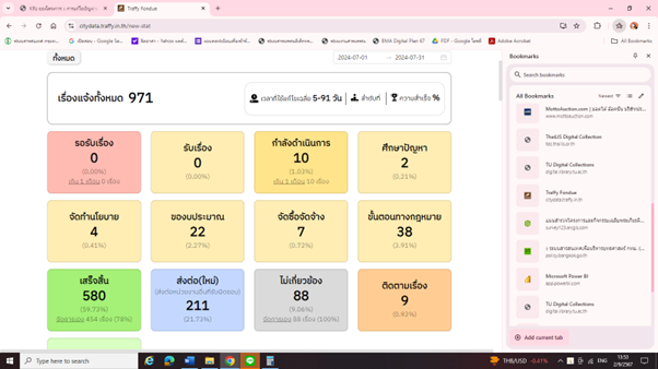 | 1500 | ![]() | 2024-07-31 00:00:00.0000000 | 86.31 | 0.00 | สถิติ Traffy Fondue สำนักงานเขตประเวศ เดือนกรกฎาคม 2567 จำนวนเรื่องแจ้งทั้งหมด 971 เรื่อง จำนวนเรื่องส่งต่อใหม่ 211 เรื่อง ไม่เกี่ยวข้อง 88 เรื่อง (จำนวนเรื่องที่สำนักงานเขตดำเนินการเอง672 เรื่อง) ดำเนินการแล้วเสร็จ580 เรื่อง คิดเป็น ร้อยละ 86.31 กำลังดำเนินการ 10 เรื่อง ศึกษาปัญหา 2 เรื่อง จัดทำนโยบาย 4 เรื่อง ของบประมาณ 22 เรื่อง จัดซื้อจัดจ้าง 7เรื่อง ขั้นตอนทางกฎหมาย 38 เรื่อง ติดตามเรื่อง 9 เรื่อง ความพึงพอใจ 3.88 | ||