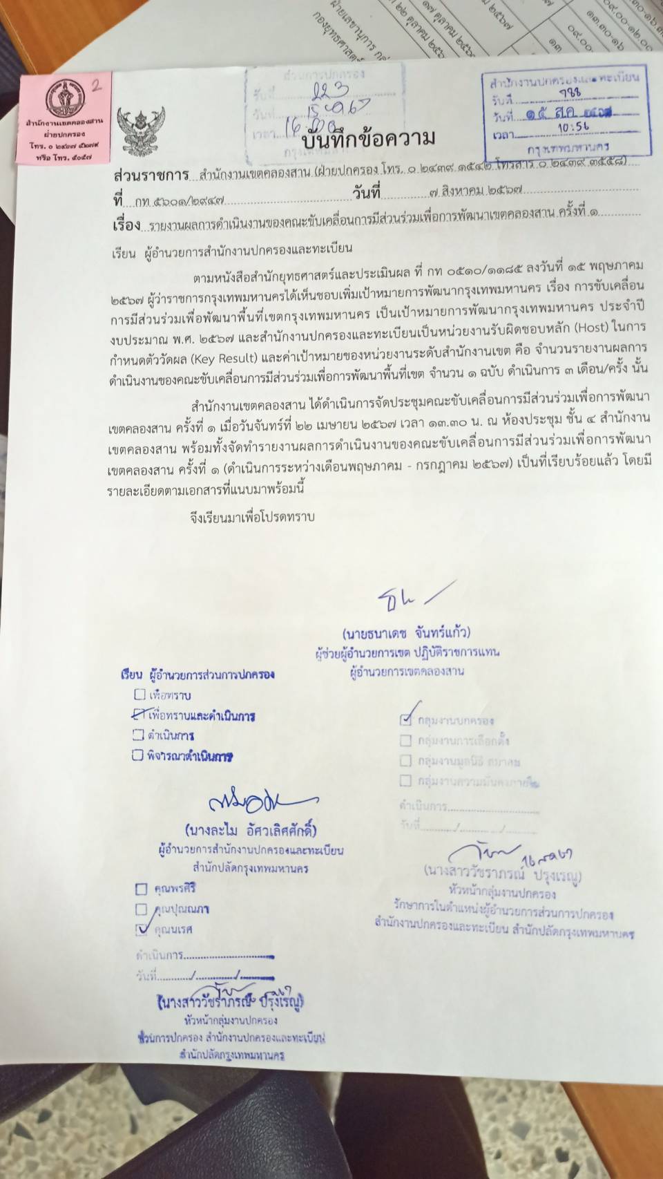 ![]() | - | จัดตั้งคณะขับเคลื่อนการมีส่วนร่วมเพื่อการพัฒนาเขต | 0.00 | 100.00 | สำนักงานเขตคลองสาน | ฝ่ายปกครอง |