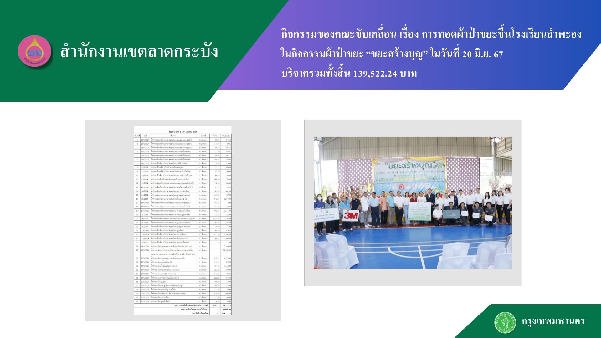 | 1596 | ![]() | 2024-07-12 00:00:00.0000000 | 0.00 | 0.00 | กิจกรรมของคณะขับเคลื่อน เรื่อง การทอดผ้าป่าขยะขึ้นโรงเรียนลำพะอง ในกิจกรรมผ้าป่าขยะ “ขยะสร้างบุญ” ในวันที่ 20 มิ.ย. 67 บริจาครวมทั้งสิ้น 139,522.24 บาท | ||