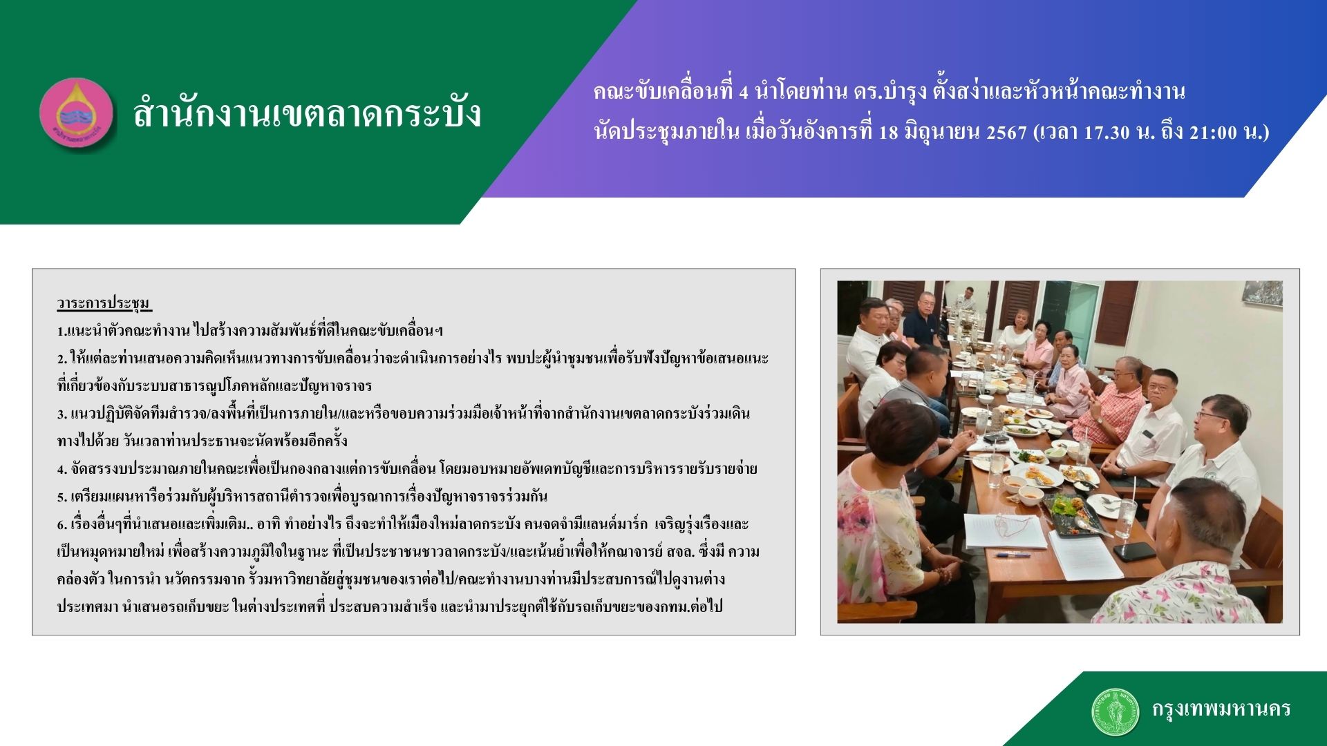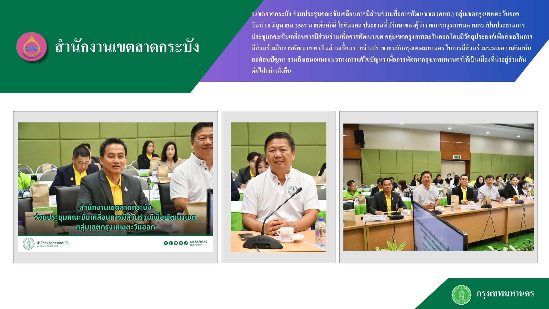 | 1596 | ![]() | 2024-07-04 00:00:00.0000000 | 0.00 | 0.00 | เขตลาดกระบัง ร่วมประชุมคณะขับเคลื่อนการมีส่วนร่วมเพื่อการพัฒนาเขต (คคพ.) กลุ่มเขตกรุงเทพตะวันออก วันที่ 18 มิถุนายน 2567 นายต่อศักดิ์ โชติมงคล ประธานที่ปรึกษาของผู้ว่าราชการกรุงเทพมหานคร เป็นประธานการประชุมคณะขับเคลื่อนการมีส่วนร่วมเพื่อการพัฒนาเขต กลุ่มเขตกรุงเทพตะวันออก โดยมีวัคถุประสงค์เพื่อส่งเสริมการมีส่วนร่วมในการพัฒนาเขต เป็นส่วนเชื่อมระหว่างประชาชนกับกรุงเทพมหานคร ในการมีส่วนร่วมระดมความคิดเห็น สะท้อนปัญหา รวมถึงเสนอแนะแนวทางการแก้ไขปัญหา เพื่อการพัฒนากรุงเทพมหานครให้เป็นเมืองที่น่าอยู่ร่วมกันต่อไปอย่างยั่งยืน | ||