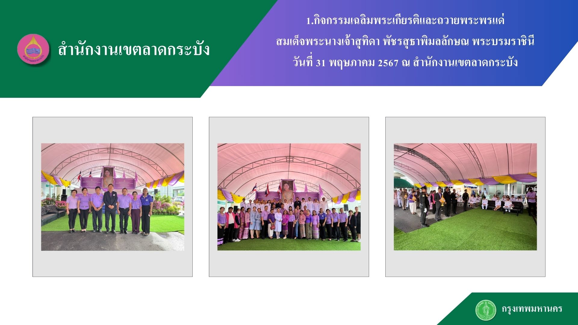 | 1596 | ![]() | 2024-06-14 00:00:00.0000000 | 0.00 | 0.00 | สำนักงานเขตลาดกระบังและคณะขับเคลื่อนฯ ในกิจกรรมเฉลิมพระเกียรติและถวายพระพรแด่สมเด็จพระนางเจ้าสุทิดา พัชรสุธาพิมลลักษณ พระบรมราชินี วันที่ 31 พฤษภาคม 2567 ณ สำนักงานเขตลาดกระบัง | ||