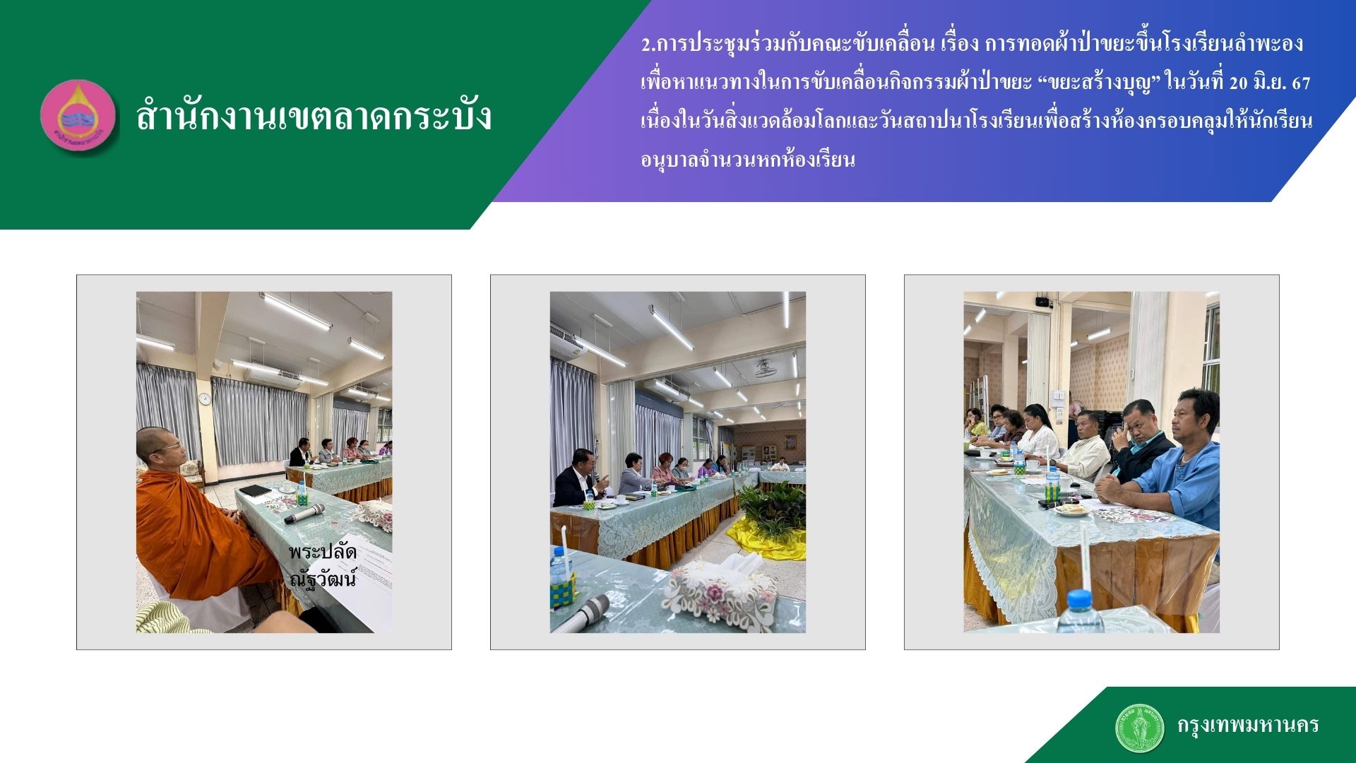 | 1596 | ![]() | 2024-06-25 00:00:00.0000000 | 0.00 | 0.00 | การประชุมร่วมกับคณะขับเคลื่อน เรื่อง การทอดผ้าป่าขยะขึ้นโรงเรียนลำพะอง เพื่อหาแนวทางในการขับเคลื่อนกิจกรรมผ้าป่าขยะ “ขยะสร้างบุญ” ในวันที่ 20 มิ.ย. 67 เนื่องในวันสิ่งแวดล้อมโลกและวันสถาปนาโรงเรียนเพื่อสร้างห้องครอบคลุมให้นักเรียนอนุบาลจำนวนหกห้องเรียน | ||