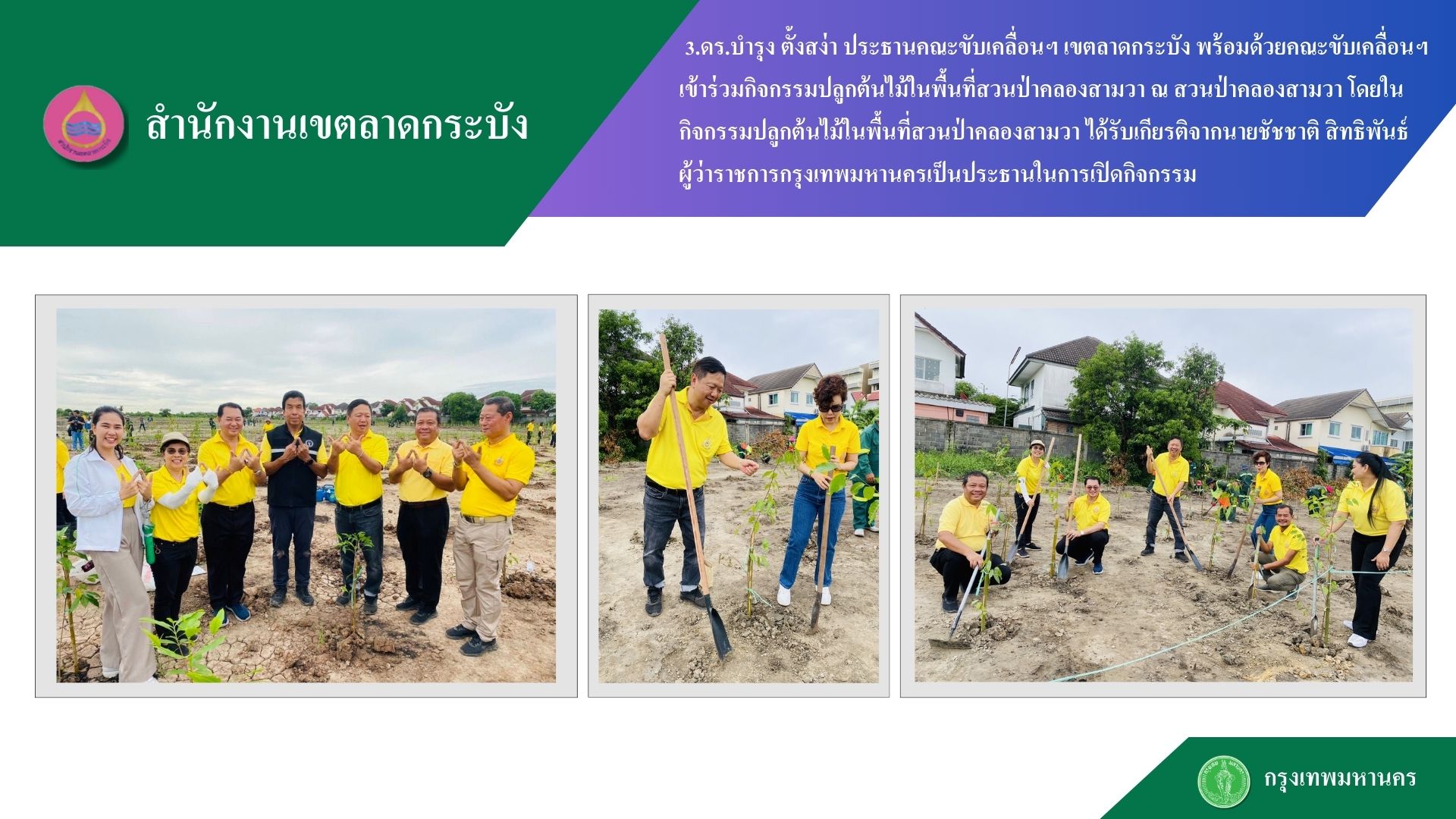 | 1596 | ![]() | 2024-06-25 00:00:00.0000000 | 0.00 | 0.00 | ดร.บำรุง ตั้งสง่า ประธานคณะขับเคลื่อนฯ เขตลาดกระบัง พร้อมด้วยคณะขับเคลื่อนฯ เข้าร่วมกิจกรรมปลูกต้นไม้ในพื้นที่สวนป่าคลองสามวา ณ สวนป่าคลองสามวา โดยในกิจกรรมปลูกต้นไม้ในพื้นที่สวนป่าคลองสามวา ได้รับเกียรติจากนายชัชชาติ สิทธิพันธ์ ผู้ว่าราชการกรุงเทพมหานครเป็นประธานในการเปิดกิจกรรม | ||