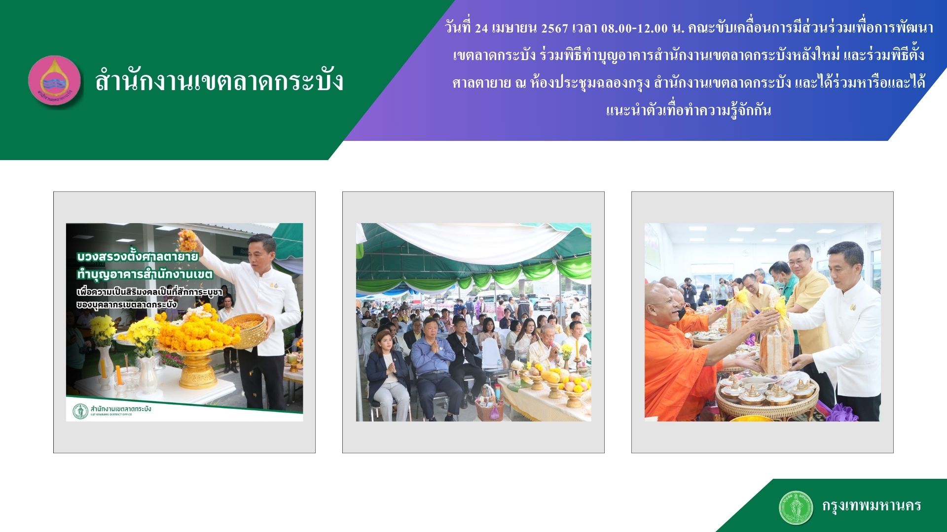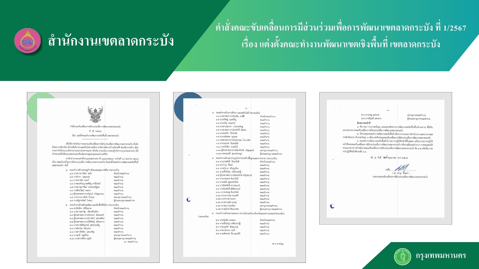 | 1596 | ![]() | 2024-07-04 00:00:00.0000000 | 0.00 | 0.00 | วันที่ 24 เมษายน 2567 สำนักงานเขตลาดกระบังได้เสนอคำสั่งฯ แต่งตั้งคณะขับเคลื่อนการมีส่วนร่วมเพื่อการพัฒนาเขตลาดกระบัง โดยได้จัดส่งให้สำนักงานปกครองและทะเบียน และปลัดกรุงเทพมหานครได้ลงนามคำสั่งกรุงเทพมหานคร ที่ 1319/2567 ลงวันที่30 เมษายน 2567 | ||