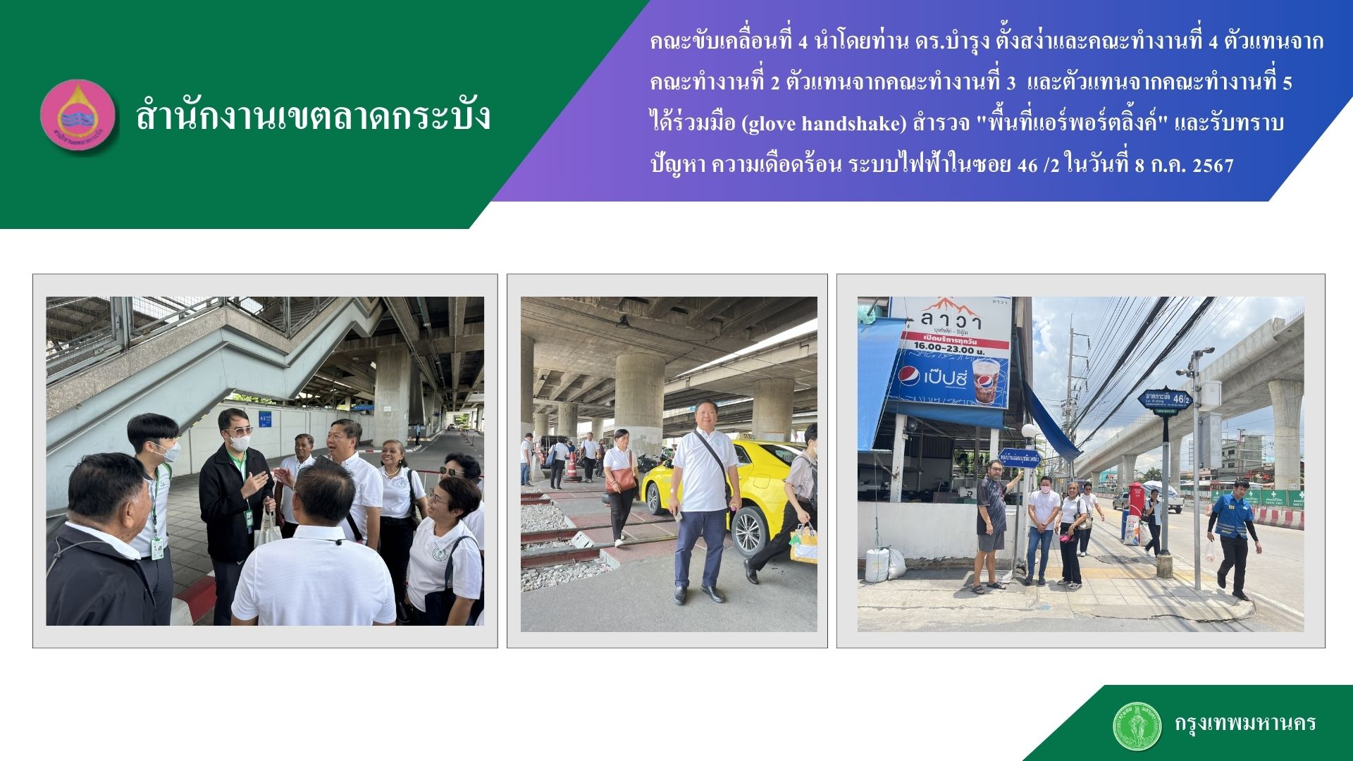 | 1596 | ![]() | 2024-07-12 00:00:00.0000000 | 0.00 | 0.00 | คณะขับเคลื่อนที่ 4 นำโดยท่าน ดร.บำรุง ตั้งสง่าและคณะทำงานที่ 4 ตัวแทนจากคณะทำงานที่ 2 ตัวแทนจากคณะทำงานที่ 3 และตัวแทนจากคณะทำงานที่ 5 ได้ร่วมมือ (glove handshake) สำรวจ "พื้นที่แอร์พอร์ตลิ้งค์" และรับทราบปัญหา ความเดือดร้อน ระบบไฟฟ้าในซอย 46 /2 ในวันที่ 8 ก.ค. 2567 | ||