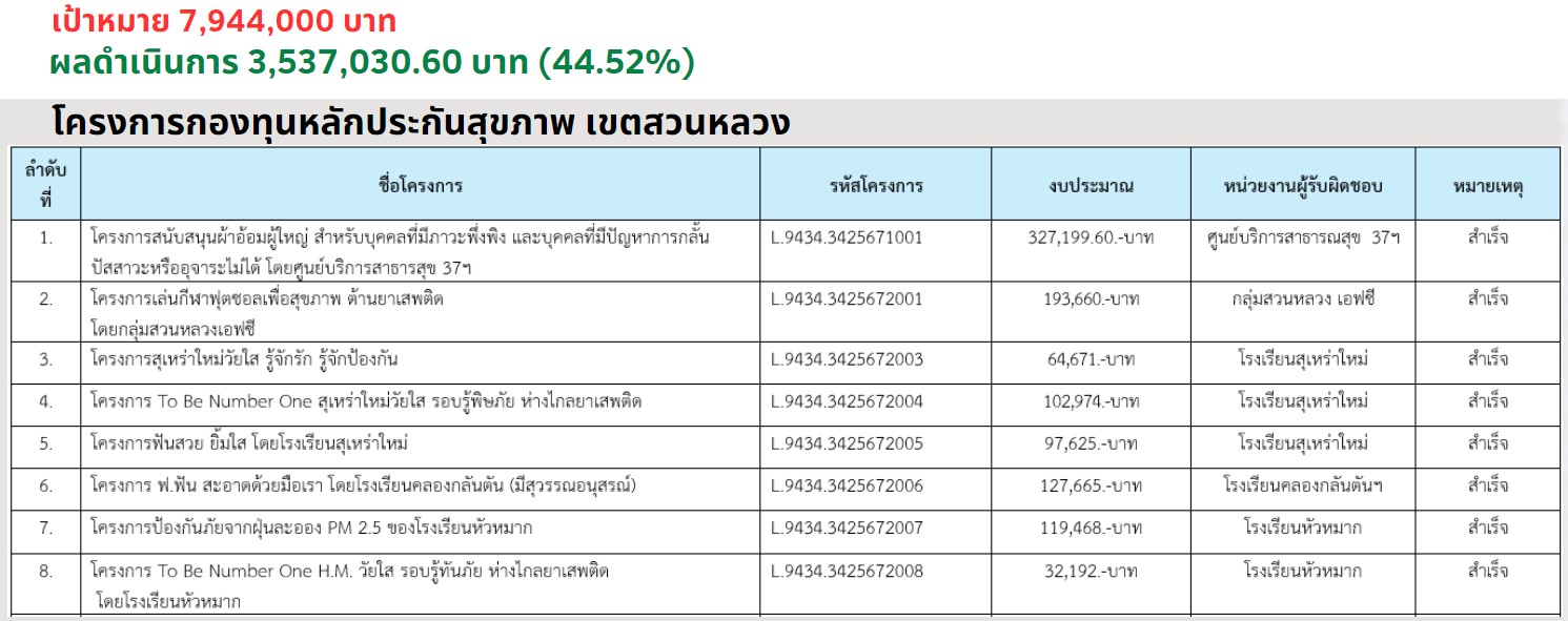 | 20 | ![]() | 2024-03-20 00:00:00.0000000 | 0.00 | 0.00 | อนุมัติโครงการ อยุ่ระหว่างการเบิกจ่าย 2 โครงการ โครงการสนับสนุนผ้าอ้อมผู้ใหญ่ สำหรับผู้มีภาวะพึ่งพิง โครงการเล่นกีฬาฟุตซอลเพื่อสุขภาพ ต้านยาเสพติด และเมื่อ 19 มีนาคม 2567 : สำนักงานเขตสวนหลวง ฝ่ายพัฒนาชุมชนและสวัสดิการสังคม (เลขานุการและอนุกรรมการกองทุนหลักประกันสุขภาพเขตสวนหลวง) ดำเนินการจัดประชุมคณะอนุกรรมการกองทุนหลักประกันสุขภาพเขตสวนหลวง ครั้งที่ 2/2567 เพื่อพิจารณาโครงการที่นำเสนอขอรับการสนับสนุนงบประมาณจากกองทุนหลักประกันสุขภาพกรุงเทพมหานคร จำนวน 7 โครงการ ซึ่งคณะอนุกรรมการได้พิจารณาโครงการเน้นย้ำให้เป็นตามวัตถุประสงค์ของกองทุนฯ โดยมี นายบัญชา สืบกระพัน ผู้อำนวยการเขตสวนหลวง ในฐานะประธานอนุกรรมการกองทุนหลักประกันสุขภาพเขตสวนหลวง เป็นประธานการประชุม พร้อมด้วยนางสาวสุชีรา เล่นวารี ผู้ช่วยผู้อำนวยการเขต หัวหน้าฝ่าย ศูนย์บริการสาธารณะสุข 37 และผู้แทนชุมชน ในฐานะรองประธานอนุกรรมการฯ และคณะอนุกรรรมการฯ เขตสวนหลวง เข้าร่วมประชุม ณ ห้องประชุมสวนหลวง ชั้น 6 สำนักงานเขตสวนหลวง | ||