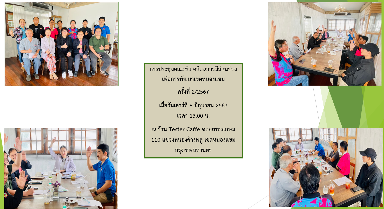 | 1596 | ![]() | 2024-07-24 00:00:00.0000000 | 0.00 | 0.00 | การประชุมคณะขับเคลื่อนการมีส่วนร่วมเพื่อการพัฒนาเขตหนองแขม ครั้งที่ 2 /2567 วันเสาร์ที่ 8 มิถุนายน 2567 เวลา 13.00 น. ณ ร้าน Tester Caffe ซอยเพชรเษม 110 แขวงหนองค้างพลู เขตหนองแขม กรุงเทพมหานคร | ||