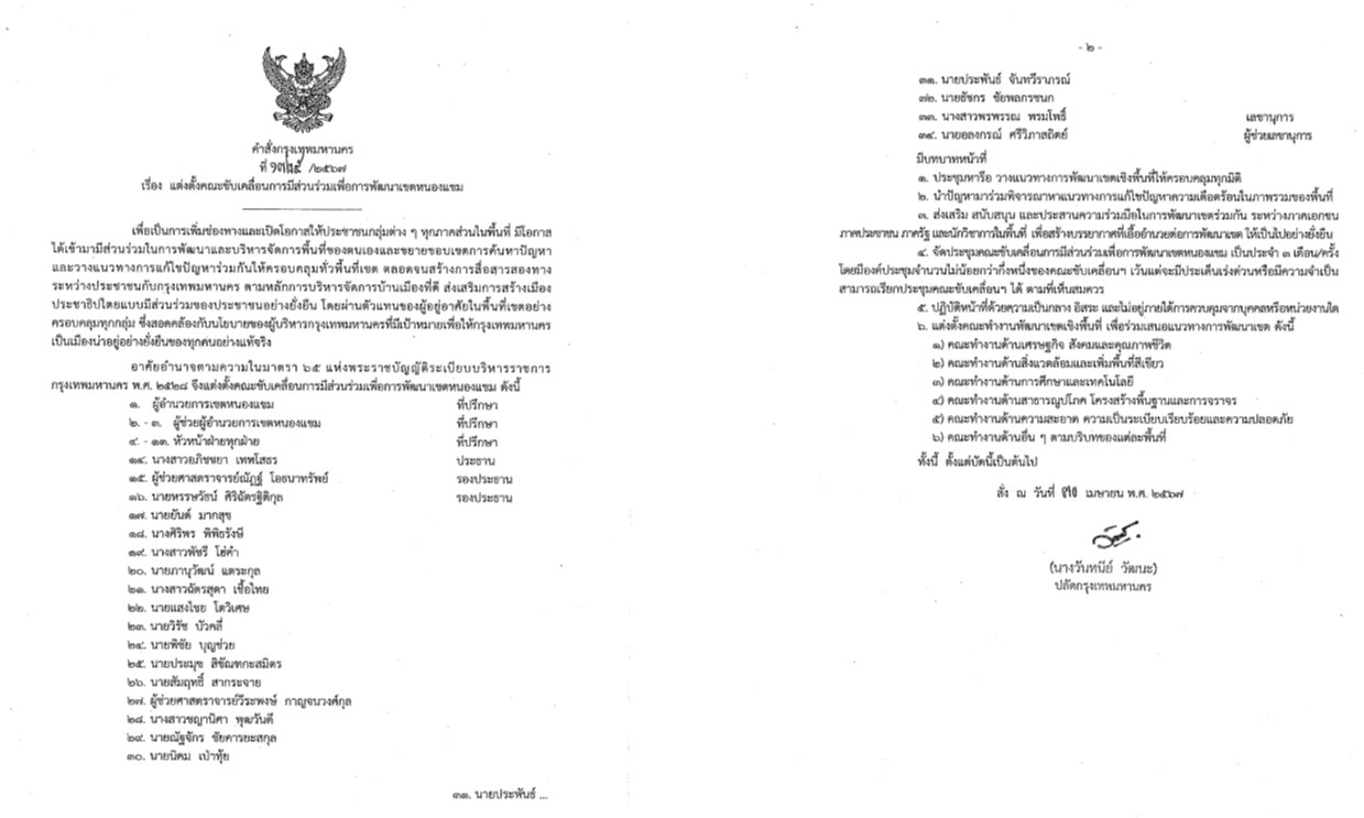 | 1596 | ![]() | 2024-07-24 00:00:00.0000000 | 0.00 | 0.00 | สำนักงานเขตหนองแขม ได้เสนอคำสั่งกรุงเทพมหานครเพื่อแต่งตั้งคณะขับเคลื่อนเพื่อการมีส่วนร่วมเพื่อการพัฒนาเขตหนองแขม โดยปลัดกรุงเทพมหานครลงนามในคำสั่งกรุงเทพมหานคร ที่ 1325/2567 ลงวันที่ 30 เมษายน 2567 เรื่อง คณะขับเคลื่อนการมีส่วนร่วมเพื่อการพัฒนาเขตหนองแขม | ||