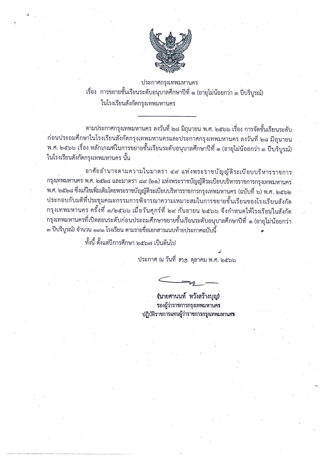 6ประกาศรายชื่อโรงเรียนในสังกัดกรุงเทพมหานครที่จัดการศึกษาระดับอนุบาลศึกษาปีที่ 1 (อายุไม่น้อยกว่า ๓ ปีบริบูรณ์)20.002023-10-01 00:00:00.00000002023-11-30 00:00:00.0000000