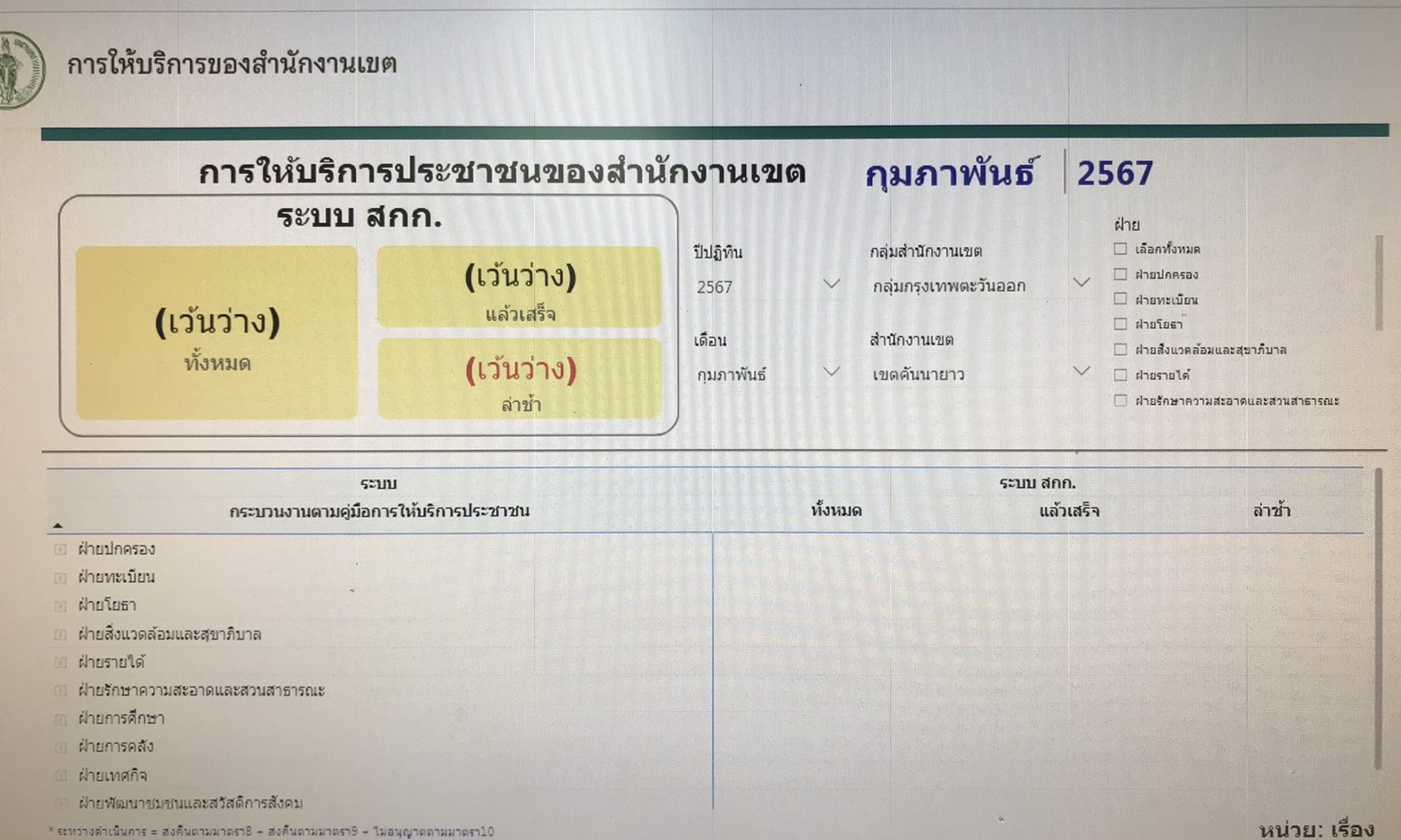 | 21 |  | 2024-02-23 00:00:00.0000000 | 100.00 | 0.00 |  | ประจำเดือนมกราคม จำนวนทั้งหมดรวม 8,128 เรื่อง จำนวนที่ดำเนินการแล้วเสร็จ 8,128 เรื่อง | |