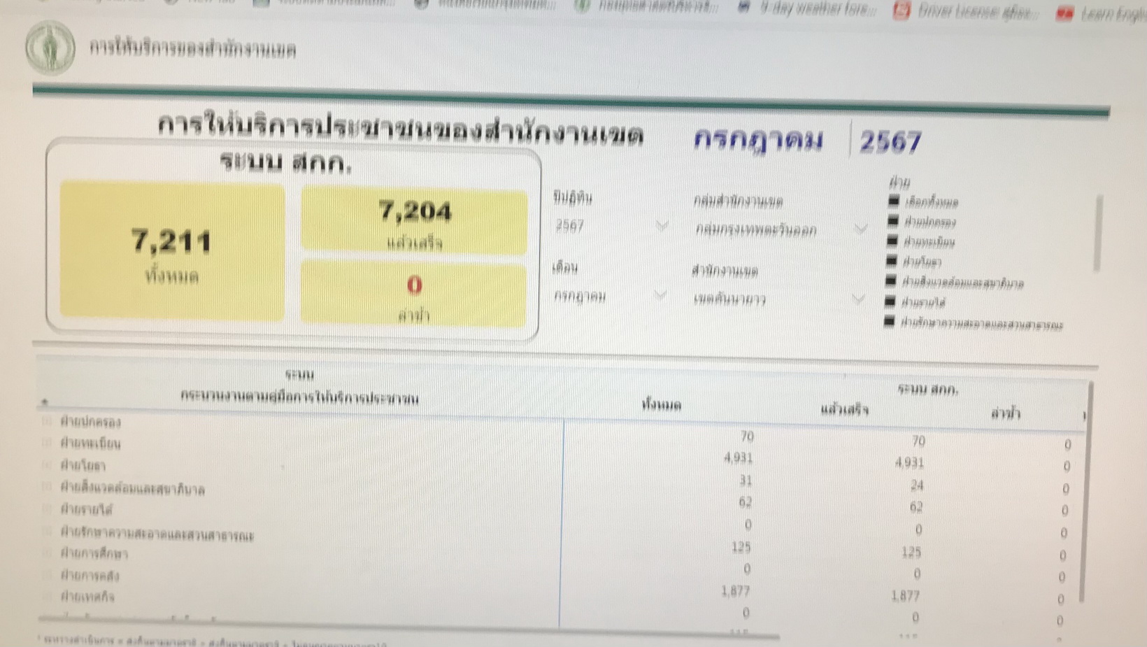 | 21 |  | 2024-08-21 00:00:00.0000000 | 100.00 | 0.00 |  | ประจำเดือนกรกฎาคม จำนวนทั้งหมดรวม 7,211 เรื่อง จำนวนที่ดำเนินการแล้วเสร็จ 7,204 เรื่อง | |