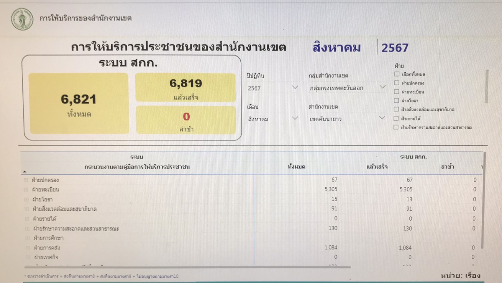 | 21 |  | 2024-09-11 00:00:00.0000000 | 100.00 | 0.00 |  | ประจำเดือนสิงหาคม จำนวนทั้งหมดรวม 6,821 เรื่อง จำนวนที่ดำเนินการแล้วเสร็จ 6,819 เรื่อง | |