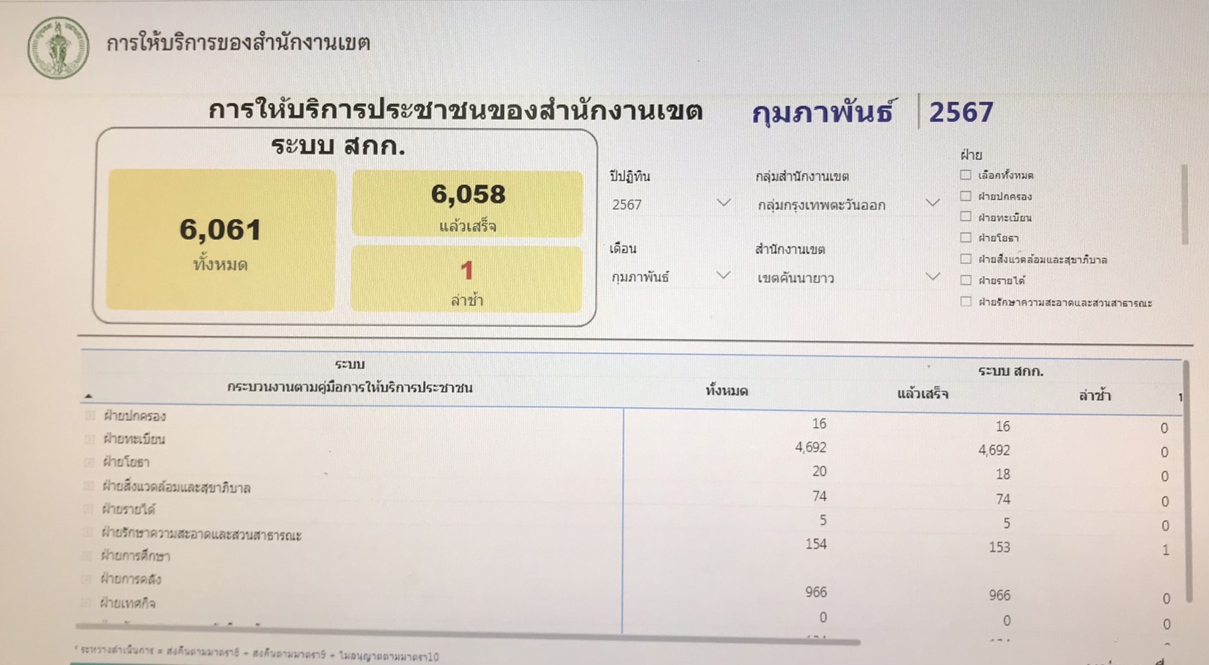 | 21 |  | 2024-03-28 00:00:00.0000000 | 100.00 | 0.00 |  | ประจำเดือนกุมภาพันธ์ จำนวนทั้งหมดรวม 6,061 เรื่อง จำนวนที่ดำเนินการแล้วเสร็จ 6,058 เรื่อง | |