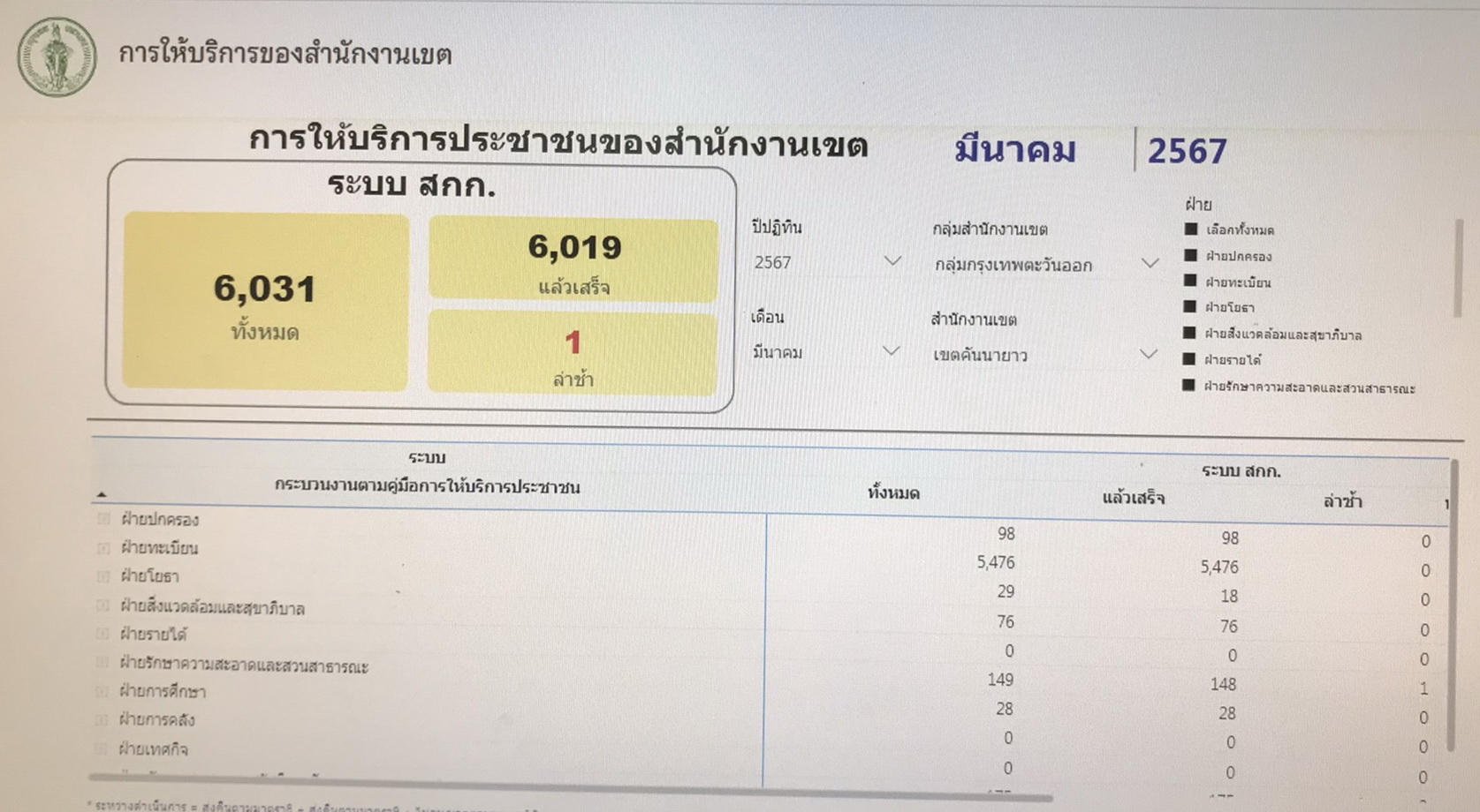 | 21 |  | 2024-04-19 00:00:00.0000000 | 100.00 | 0.00 |  | ประจำเดือนมีนาคม จำนวนทั้งหมดรวม 6,031 เรื่อง จำนวนที่ดำเนินการแล้วเสร็จ 6,019 เรื่อง | |
