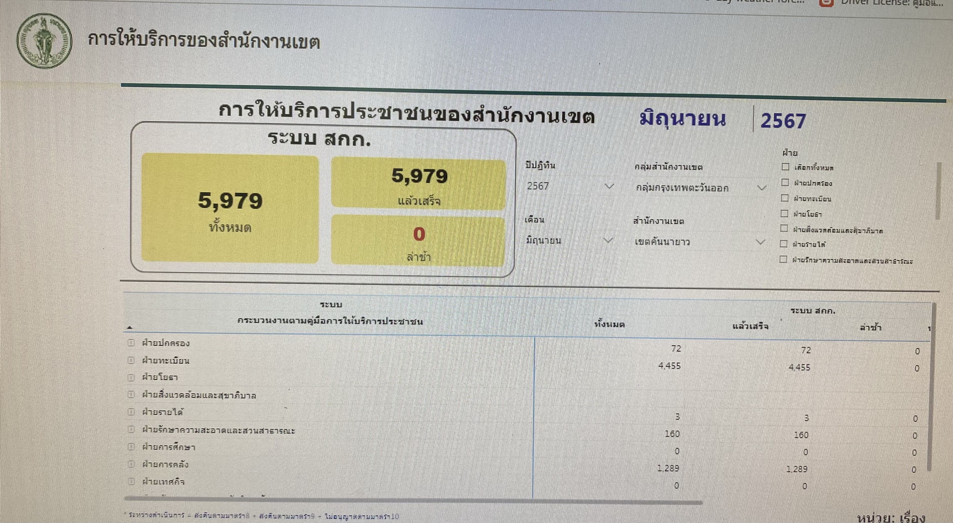 | 21 |  | 2024-07-11 00:00:00.0000000 | 100.00 | 0.00 |  | ประจำเดือนมิถุนายน จำนวนทั้งหมดรวม 5,979 เรื่อง จำนวนที่ดำเนินการแล้วเสร็จ 5,979 เรื่อง | |