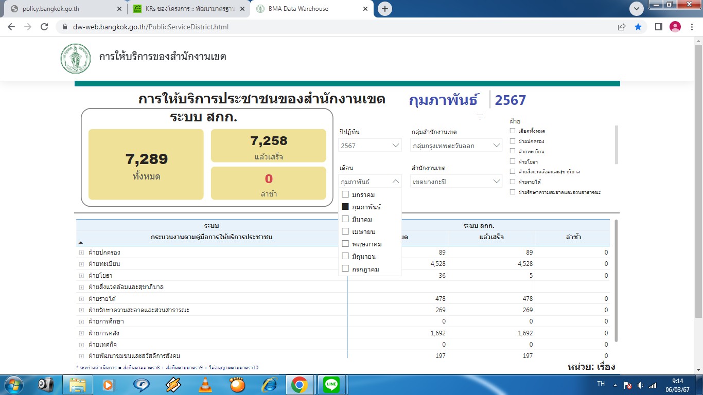 | 21 | ![]() | 2024-03-05 00:00:00.0000000 | 100.00 | 0.00 | เดือนกุมภาพันธ์ 2567 จำนวนเรื่องทั้งหมด 7,289 จำนวนเรื่องที่ดำเนินการแล้วเสร็จ 7,258 | ||