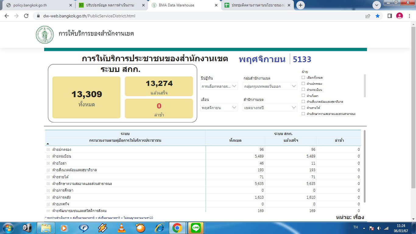 | 21 | ![]() | 2023-11-30 00:00:00.0000000 | 100.00 | 0.00 | เดือนพฤศจิกายน 2566 จำนวนเรื่องทั้งหมด 13,309 จำนวนเรื่องที่ดำเนินการแล้วเสร็จ 13,274 |