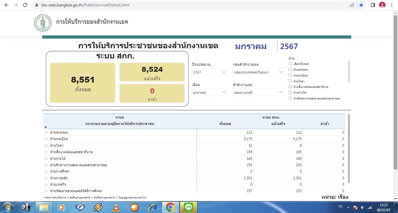 | 21 | ![]() | 2024-02-08 00:00:00.0000000 | 100.00 | 0.00 | เดือนมกราคม 2567 จำนวนเรื่องทั้งหมด 8,551 จำนวนเรื่องที่ดำเนินการแล้วเสร็จ 8,524 | ||