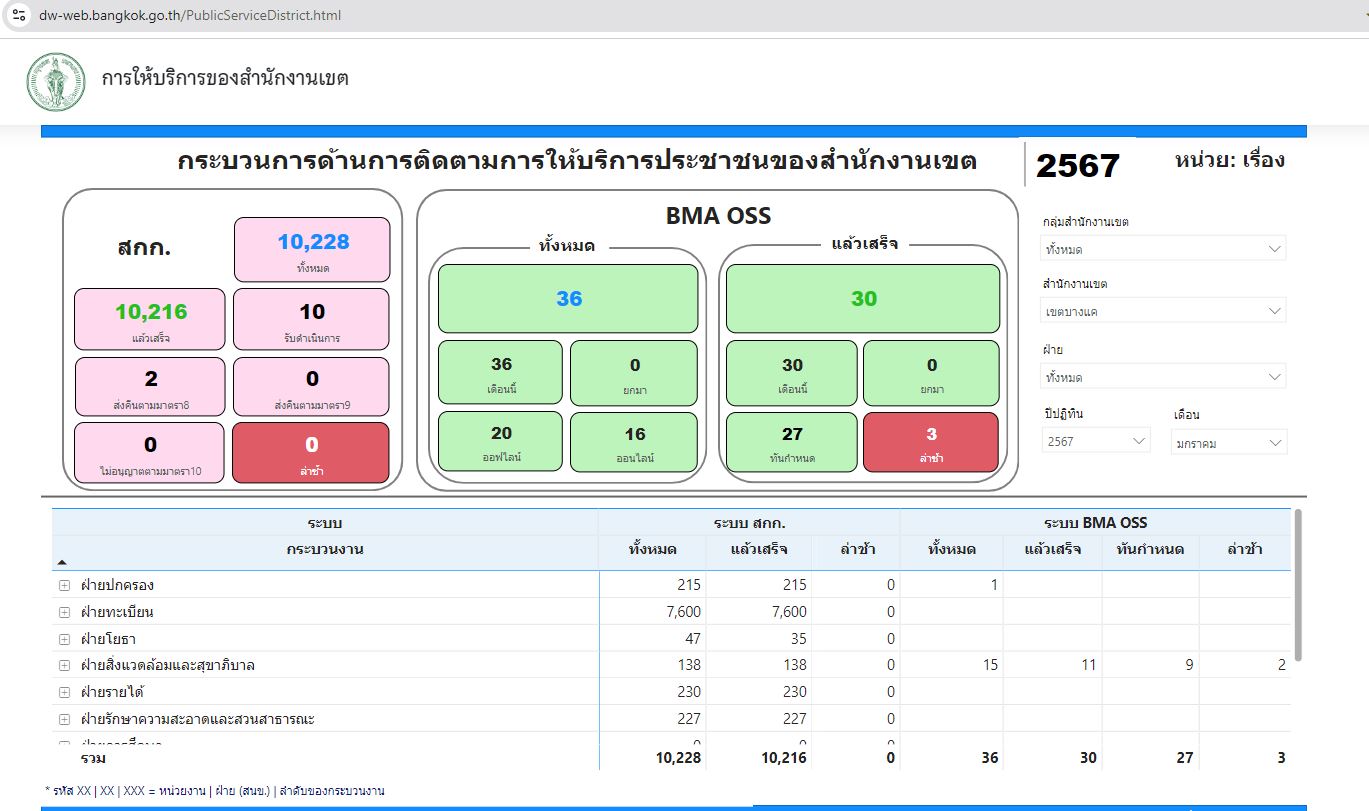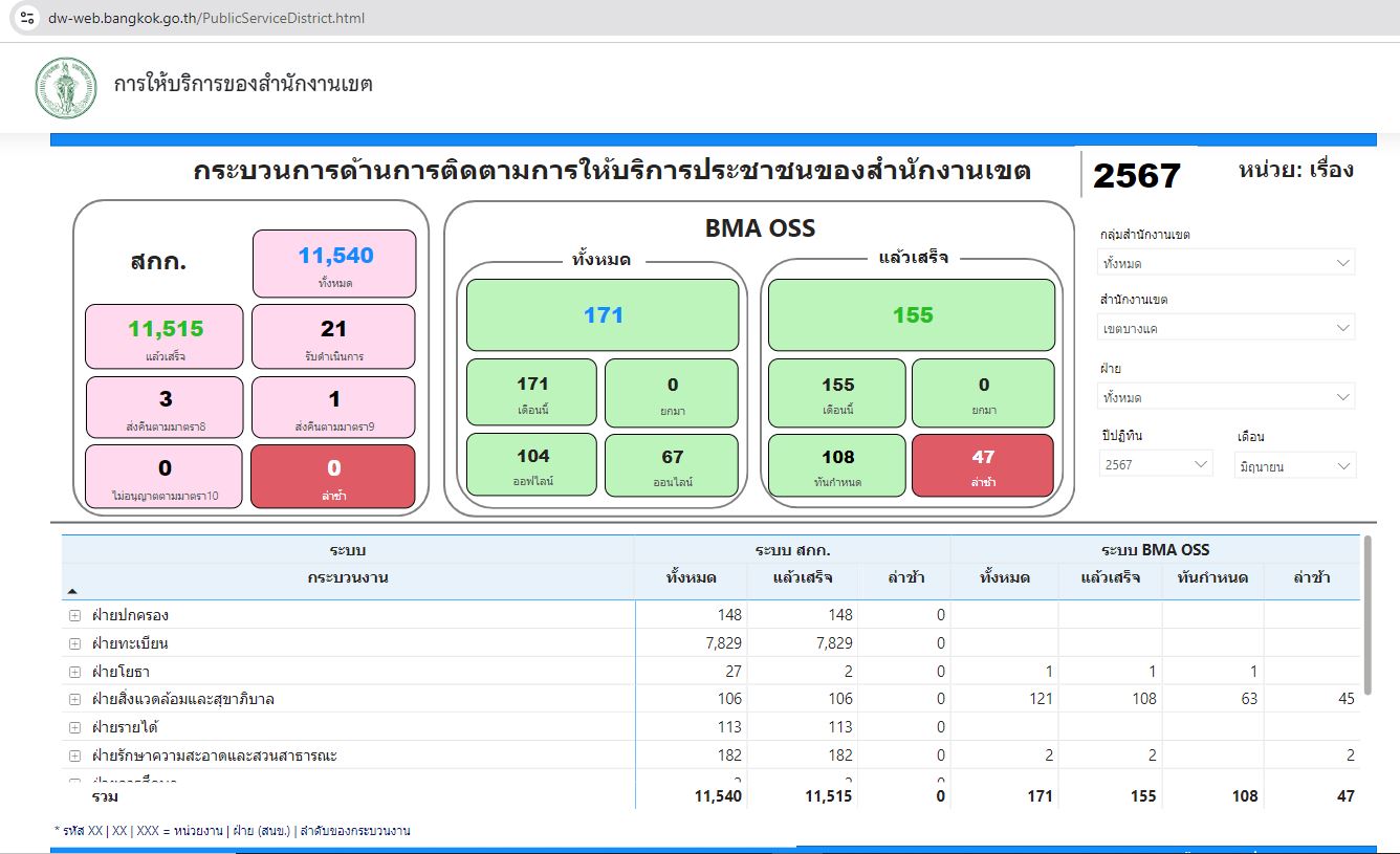 | 21 | ![]() | 2024-07-08 00:00:00.0000000 | 100.00 | 0.00 | สถิติข้อมูลการให้บริการประชาชน ณ สำนักงานเขตจากลิงก์ https://dw-web.bangkok.go.th/PublicServiceDistrict.html เดือน มิ.ย. 67 11,540 ราย แล้วเสร็จ 11,515 ราย (รับดำเนินการ 21 ราย, ส่งคืนตามมาตรา 8 3 ราย, ส่งคืนตามมาตรา 9 1 ราย) | ||