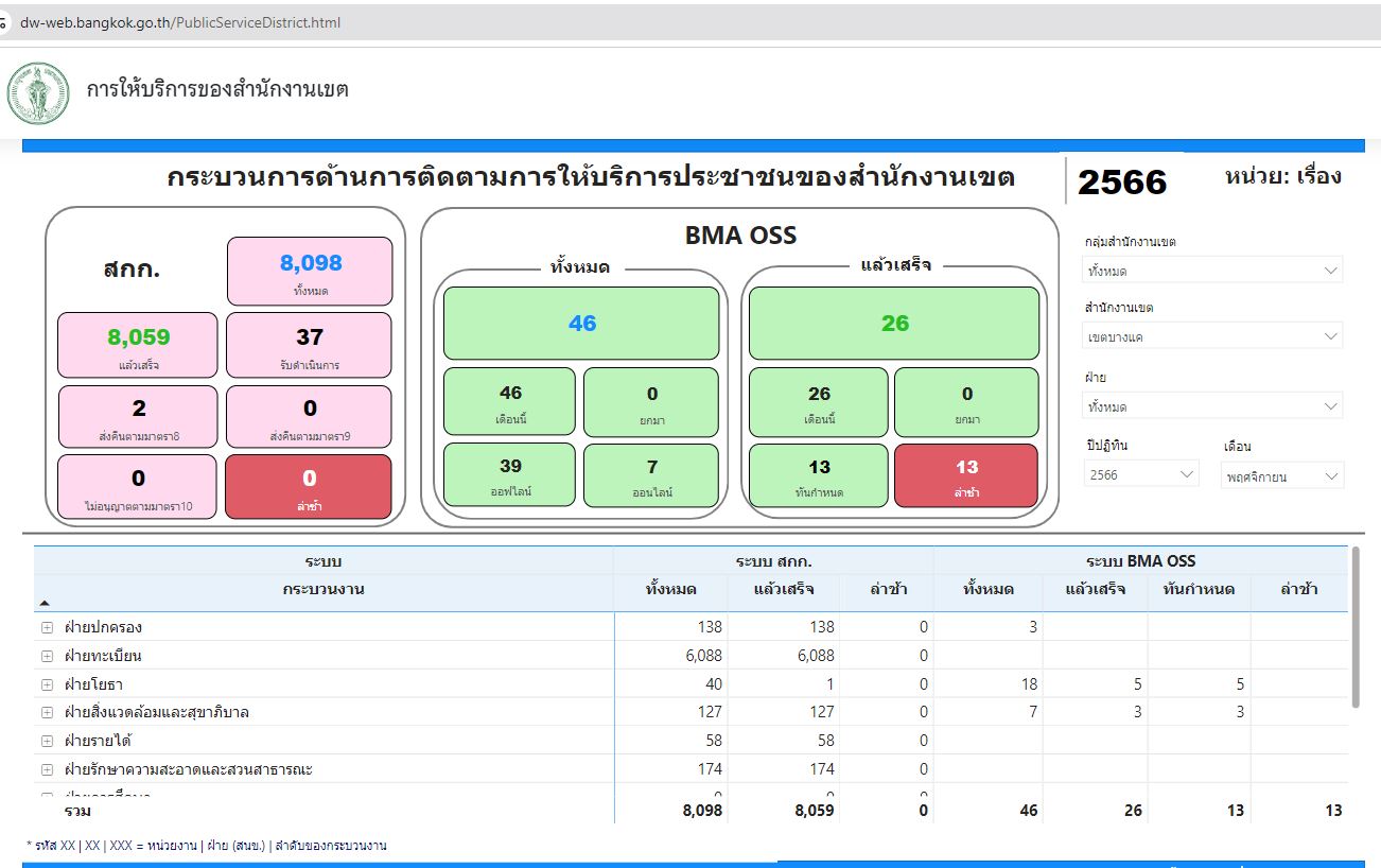 | 21 | ![]() | 2023-11-30 00:00:00.0000000 | 100.00 | 0.00 | สถิติข้อมูลการให้บริการประชาชน ณ สำนักงานเขตจากลิงก์ https://dw-web.bangkok.go.th/PublicServiceDistrict.html เดือน พ.ย. 66 8,098 ราย แล้วเสร็จ 8,059 ราย (รับดำเนินการ 37 ราย, ส่งคืนตามมาตรา 8 2 ราย) |