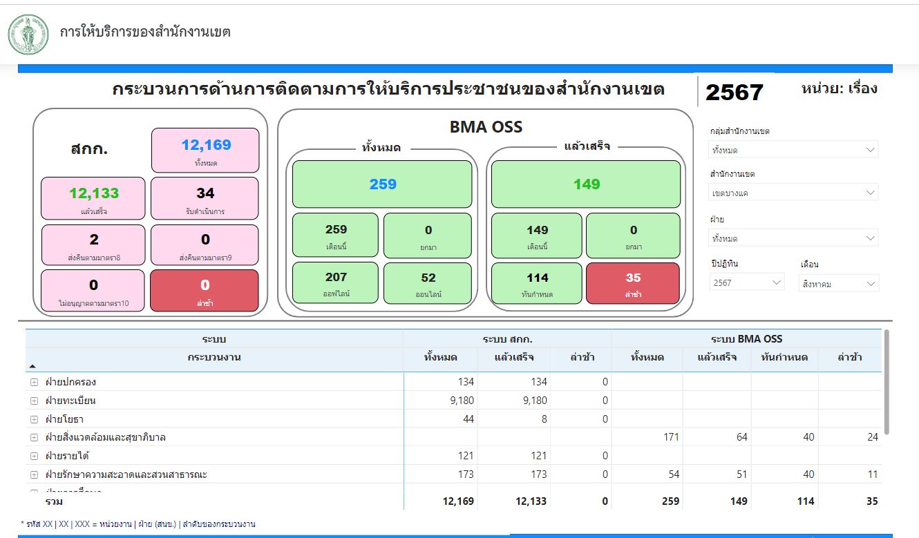 | 21 | ![]() | 2024-09-09 00:00:00.0000000 | 100.00 | 0.00 | สถิติข้อมูลการให้บริการประชาชน ณ สำนักงานเขตจากลิงก์ https://dw-web.bangkok.go.th/PublicServiceDistrict.html เดือน ส.ค. 67 12,169 ราย แล้วเสร็จ 12,133 ราย (รับดำเนินการ 34 ราย, ส่งคืนตามมาตรา 8 2 ราย) | ||
