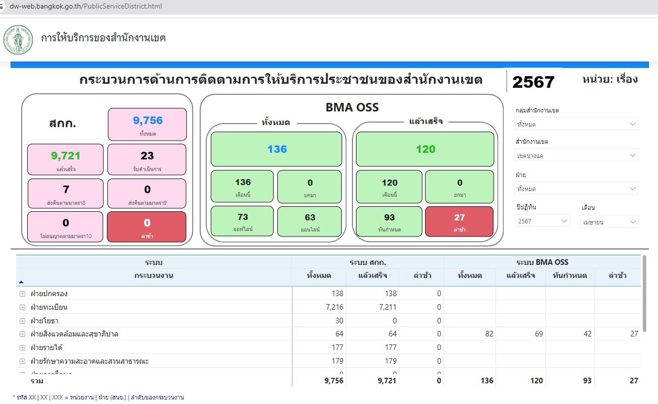 | 21 | ![]() | 2024-05-13 00:00:00.0000000 | 100.00 | 0.00 | สถิติข้อมูลการให้บริการประชาชน ณ สำนักงานเขตจากลิงก์ https://dw-web.bangkok.go.th/PublicServiceDistrict.html เดือน เม.ย. 67 9,756 ราย แล้วเสร็จ 9,721 ราย (รับดำเนินการ 23 ราย, ส่งคืนตามมาตรา 8 7 ราย) | ||