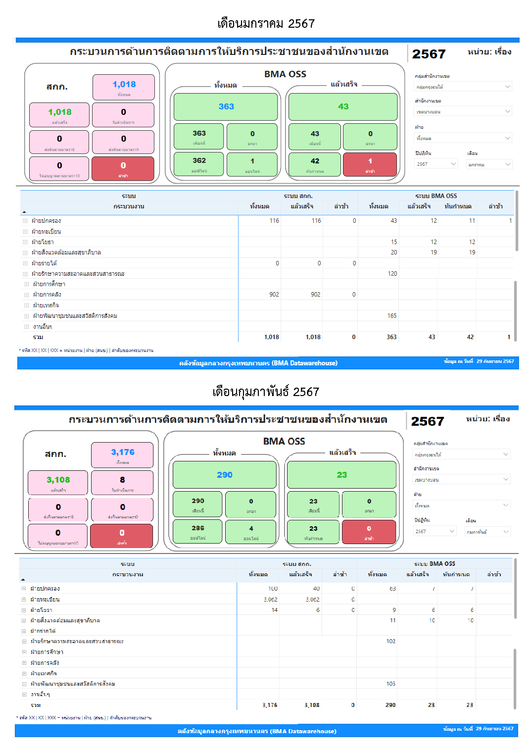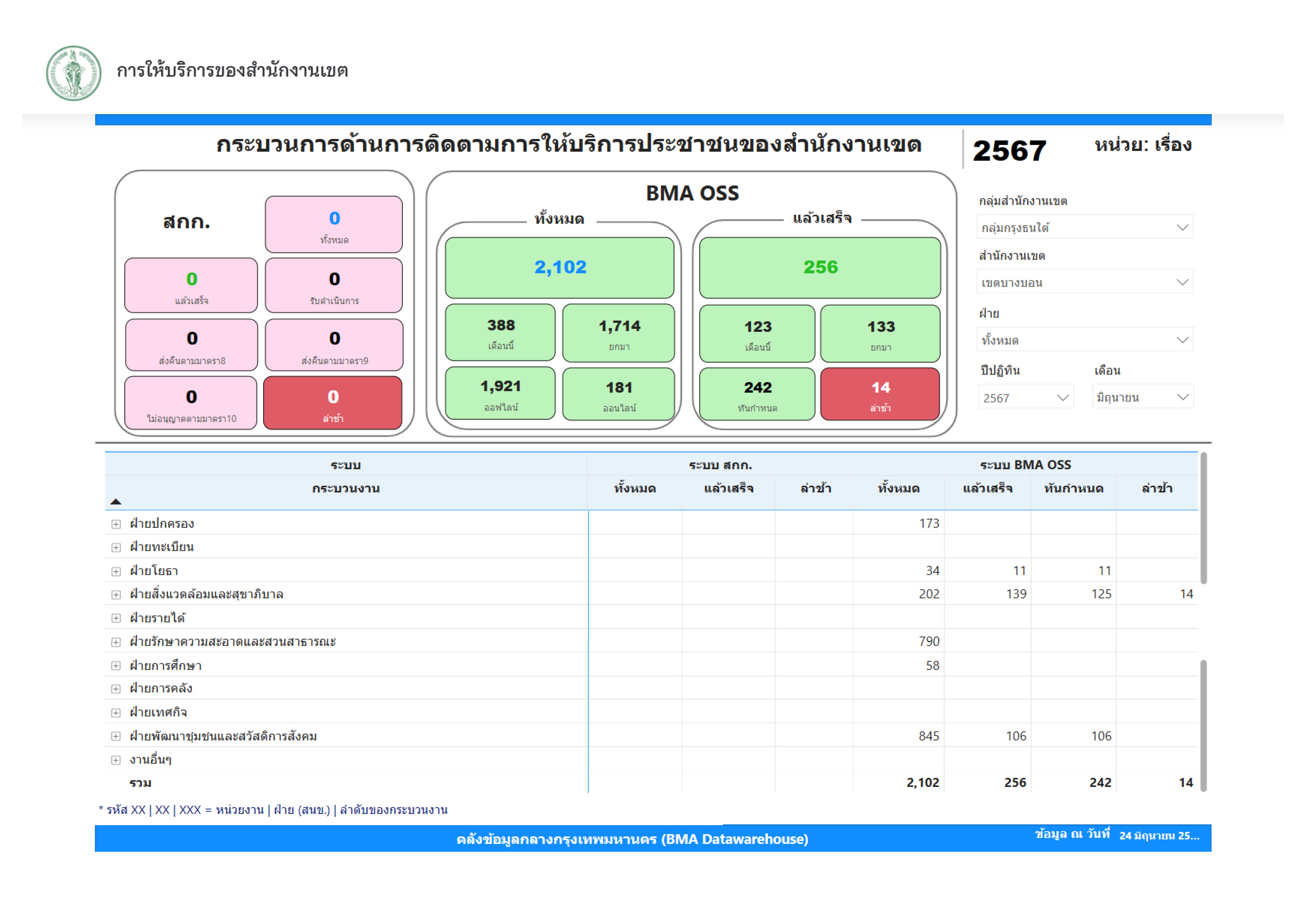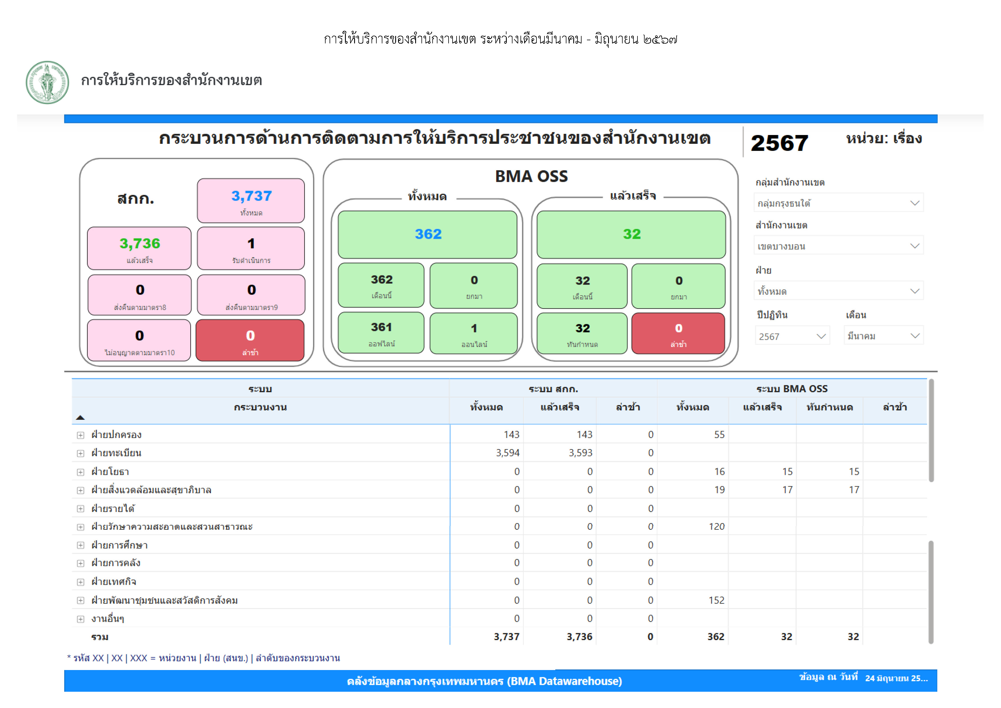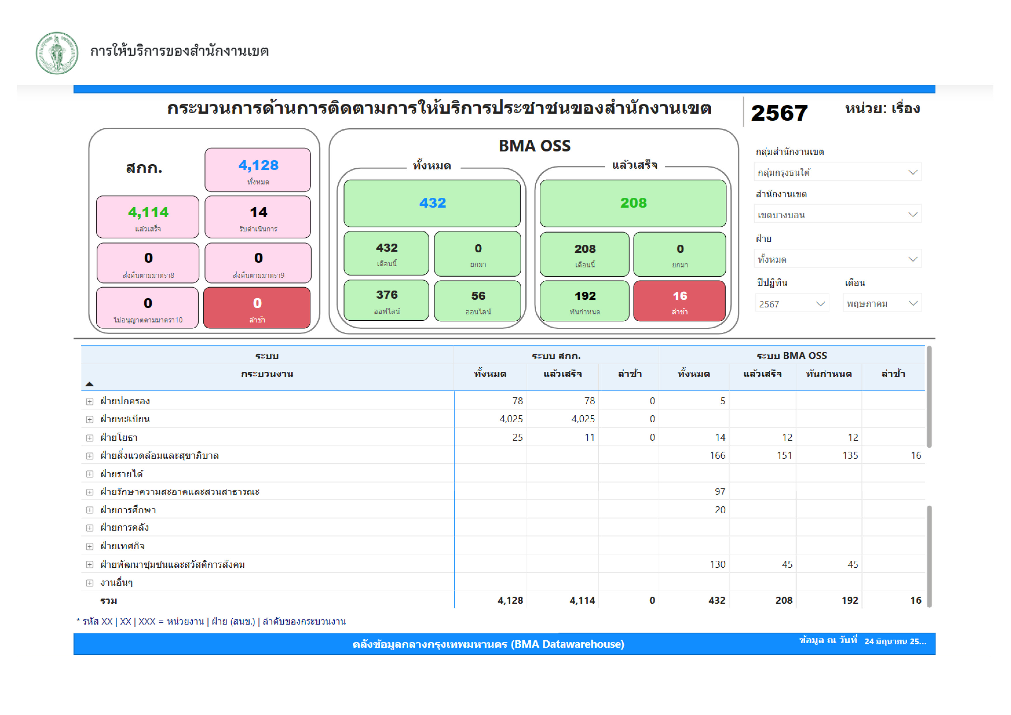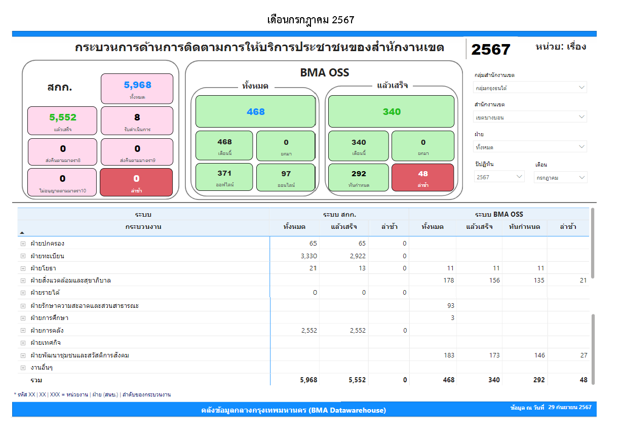 | 21 | ![]() | 2024-09-05 00:00:00.0000000 | 0.00 | 0.00 | ผลการดำเนินงานตั้งแต่เดือนเมษายน 2567 มีคำขอรับบริการในระบบ BMA OSS จำนวน 467 เรื่อง ดำเนินการแล้วเสร็จจำนวน 130 เรื่อง ทันกำหนด 110เรื่อง ล่าช้า 20 เรื่อง | ||