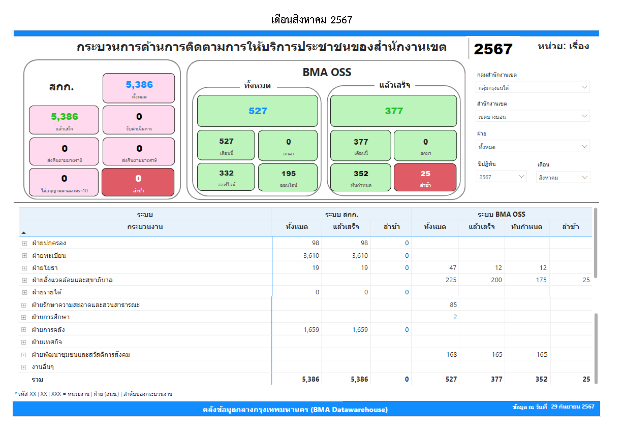 | 21 | ![]() | 2024-09-05 00:00:00.0000000 | 0.00 | 0.00 | ผลการดำเนินงานตั้งแต่เดือนสิงหาคม 2567 มีคำขอรับบริการในระบบ BMA OSS จำนวน 5386 เรื่อง ดำเนินการแล้วเสร็จจำนวน 377 เรื่อง ทันกำหนด 352 เรื่อง ล่าช้า 25 เรื่อง | ||