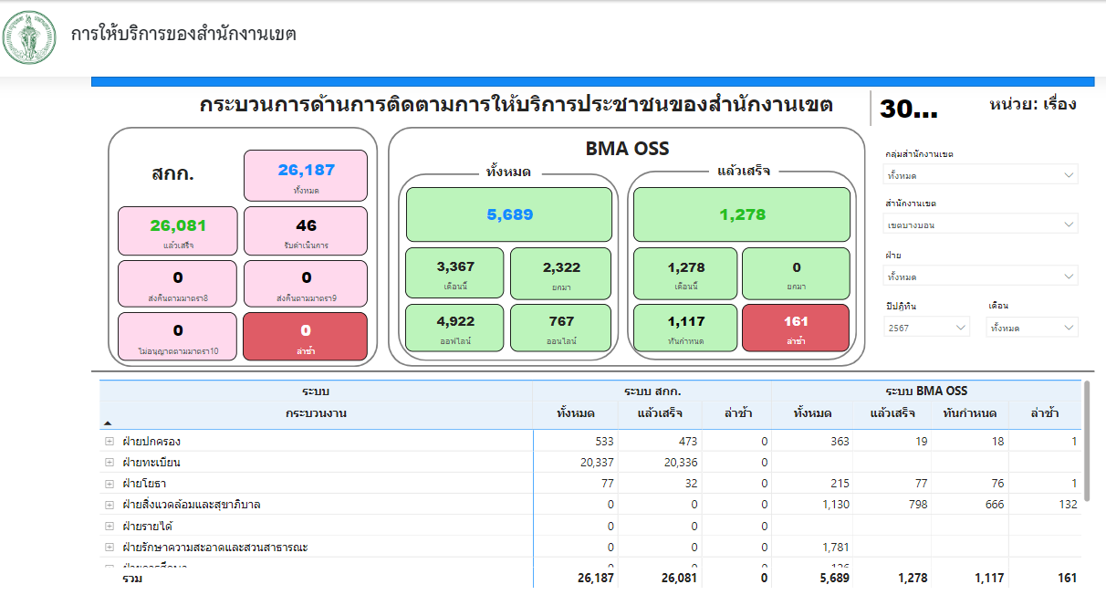 | 21 | ![]() | 2024-09-02 00:00:00.0000000 | 100.00 | 0.00 | ผลการดำเนินงานตั้งแต่เดือนตุลาคม - ธันวาคม 2566 มีคำขอรับบริการในระบบ BMA OSS จำนวน 5,689 เรื่อง ดำเนินการแล้วเสร็จจำนวน 1,278 เรื่อง ทันกำหนด 1,117 เรื่อง ล่าช้า 161 เรื่อง คิดเป็นร้อยละ 87.40 |